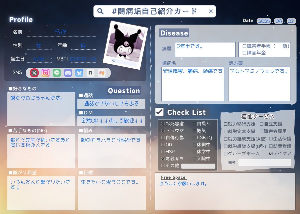闘病垢カードやってみた ♡or↺で気になりさん絡みに行きます #闘病垢自己紹介カード #闘病垢さんと繋がりたい #闘病垢さんと仲良くなりたい #裏垢さんと繋がりたい pic.x.com/2pHlKxMziq