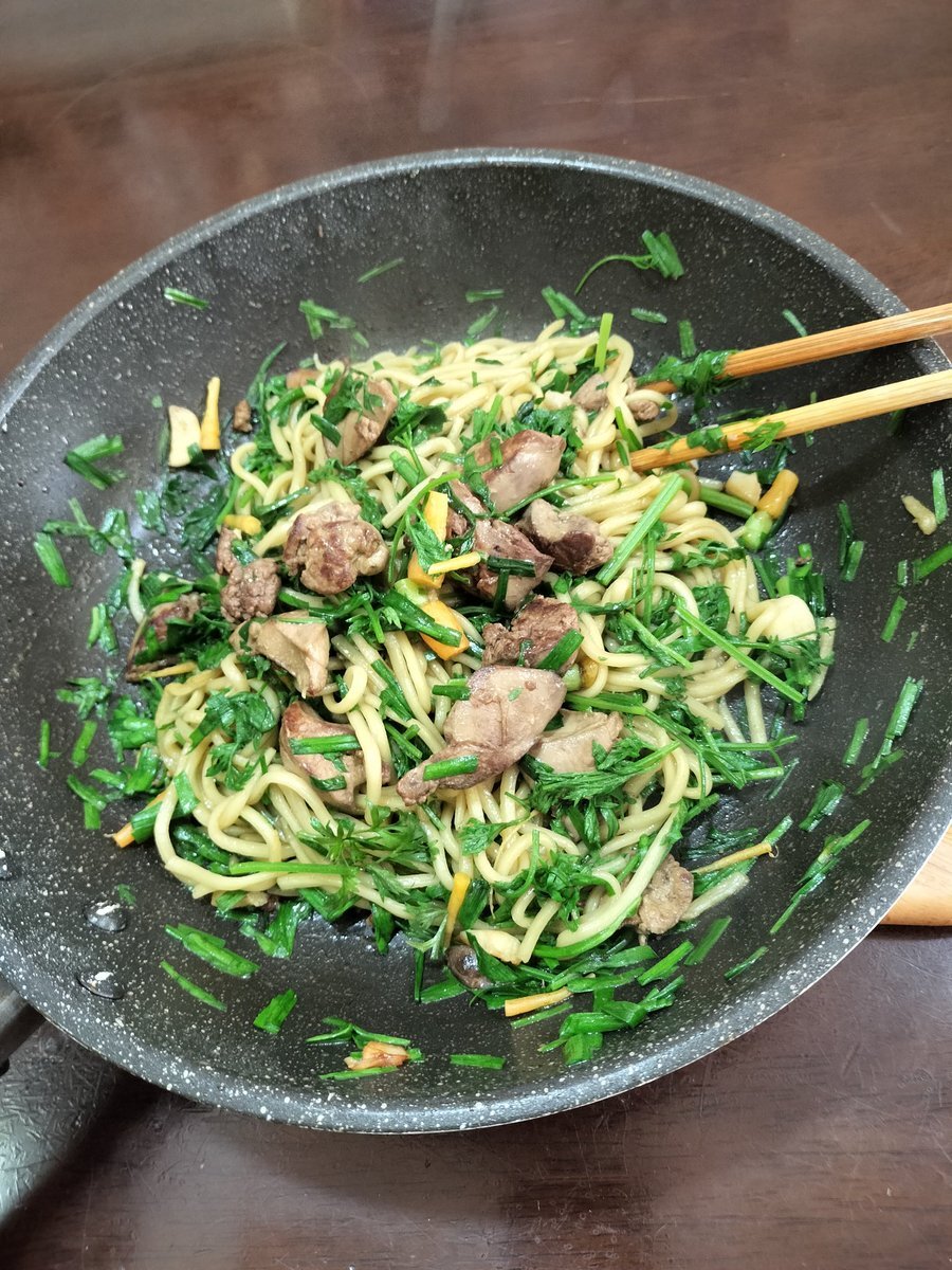 朝採れ ニラと鶏レバーの オイスター焼きそば パクチーっぽく 間引き人参をのせて👨‍🍳 奥さんが友達とランチに行ったので 奥さんが苦手なレバーを食べました #家庭菜園 #裏庭畑 #週末農家 #ニラ #人参 #おじさん料理 pic.x.com/a85m2yTqzh
