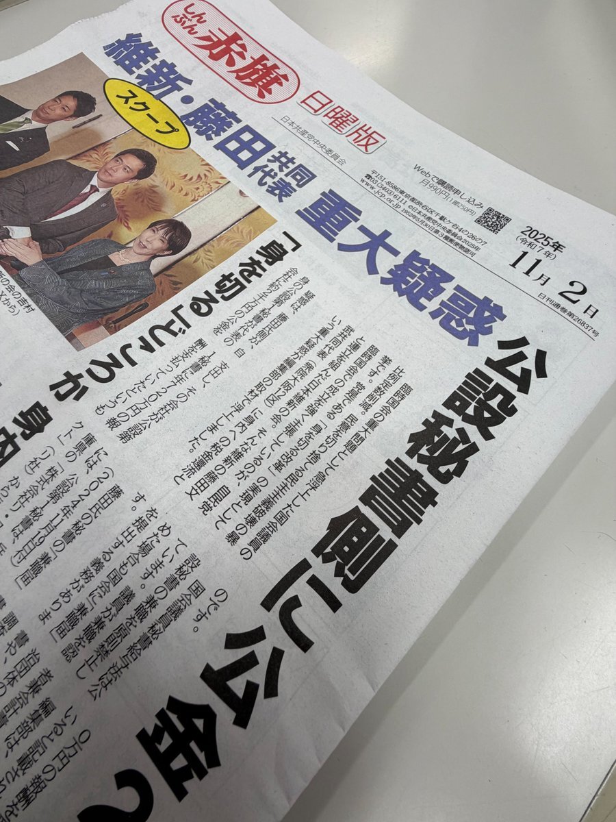 「しんぶん赤旗」日曜版最新号のスクープです。日本維新の会の藤田文武共同代表側が、公設第1秘書の会社にビラ印刷など2千万円の公金を支出したことが判明しました。同社はこの秘書に年720万円報酬を払っていました。しかもこの会社は印刷機をもっていません。身内への税金環流疑惑です。