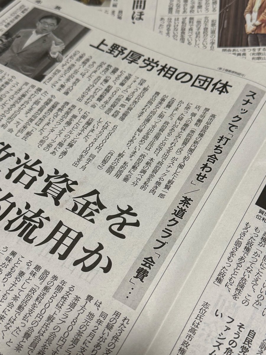 「しんぶん赤旗」のスクープです。高市政権で初入閣した上野賢一郎厚労相が、スナックの代金や個人の趣味と見られる支払いを、政治資金から支出していたことが分りました。力士を労う花火の打ち上げ参加費なども支出。政治資金の私的流量が疑われます。
