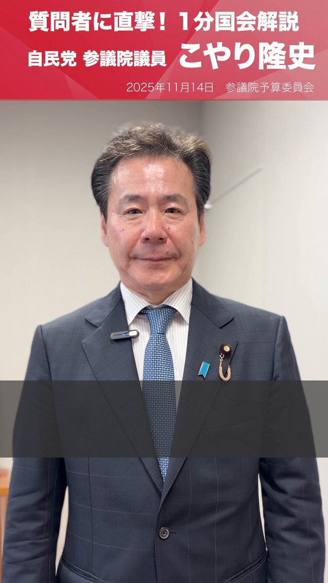 【1分国会解説】参議院予算委員会の質疑に立った #こやり隆史 参議院議員を直撃 こんにちは。 参議院議員のこやり隆史でございます。 今日は参議院予算委員会におきまして、高市総理をはじめ、閣僚の皆さんと議論をさせていただきました。
