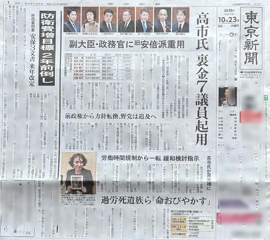 在京6紙のうち、高市内閣が副大臣と政務官に「裏金議員」7人を起用したことを朝刊1面のトップ記事にしたのは東京新聞だけ。他の1面記事も「防衛費増目標2年前倒し 所信表明案」「労働時間規制から一転 緩和検討指示」。高市内閣の動きをしっかり伝えています