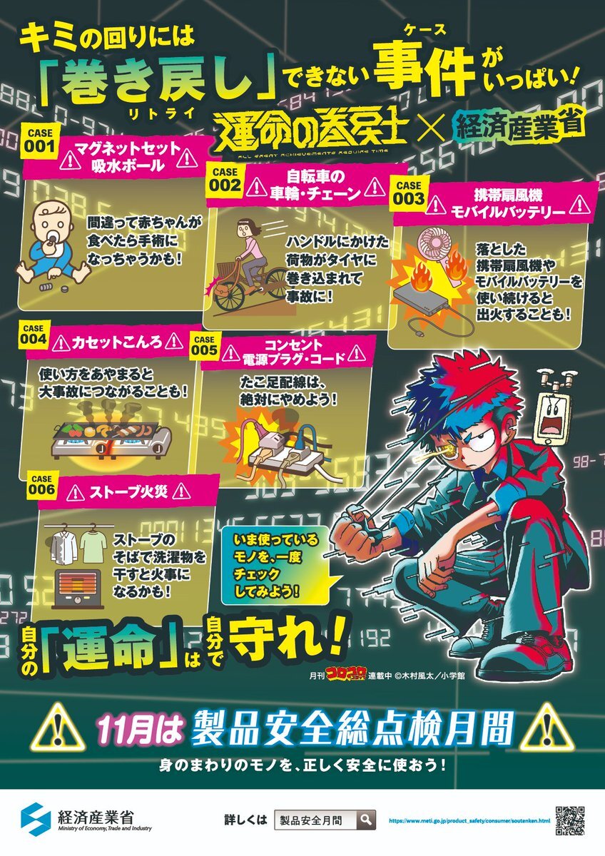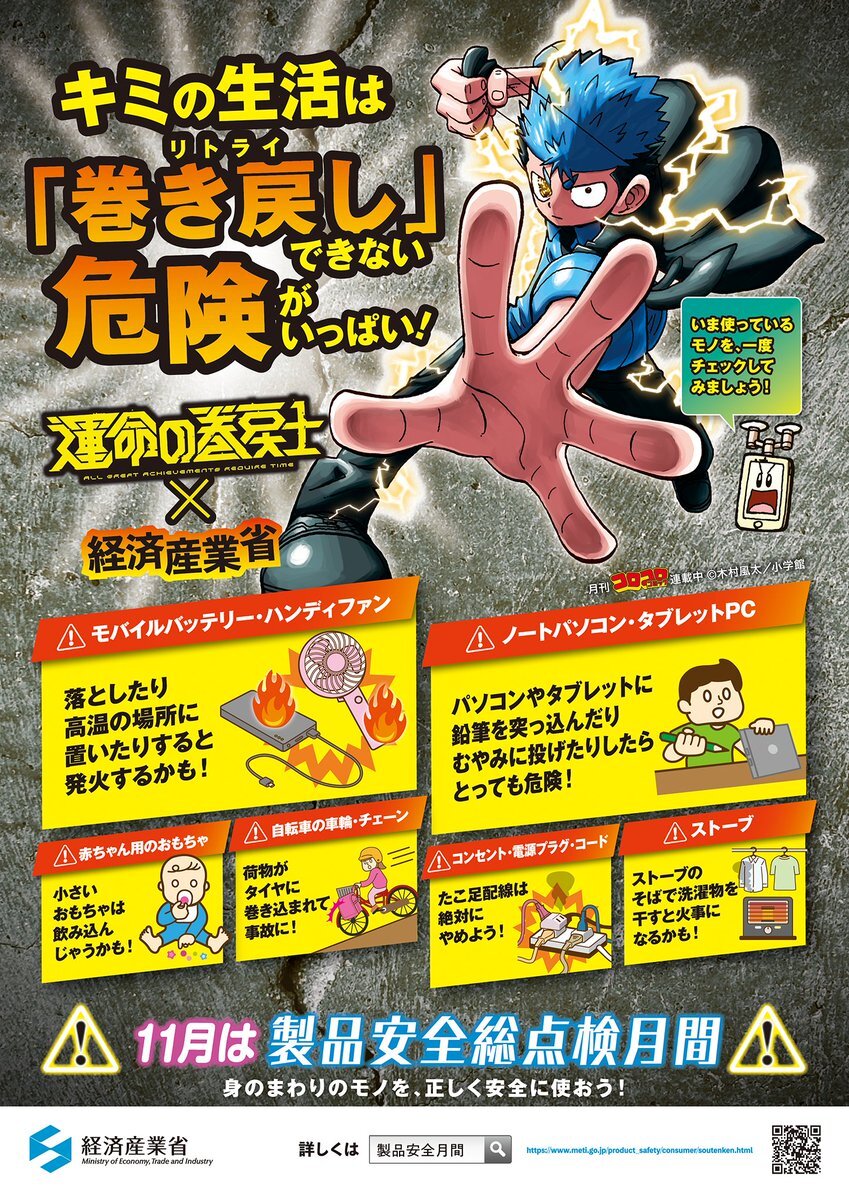 11月は #製品安全総点検月間 です! 身の回りの安全について、今一度点検してみませんか? 今年は #運命の巻戻士 とコラボレーション⏱ 「巻き戻し」出来ない危険な事故・・・安全点検で自分の「運命」は自分で守れ! pic.x.com/Msqk3Vlp7G