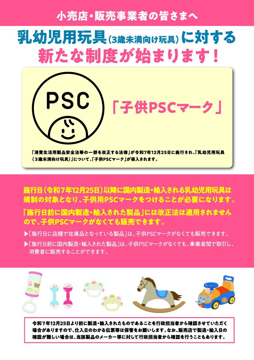 【製造業・輸入業に携わる皆様へ!】 12月25日より3歳未満向けの玩具に対する新たな規制が始まります。届出義務を履行した上で子供PSCマークや適切な表示がある製品のみが販売可能となります。 この機会に事前にご確認ください。 kanto.meti.go.jp/seisaku/seihin… #製品安全 #製品安全総点検月間 #製品事故 pic.x.com/PgFMvnfqSh