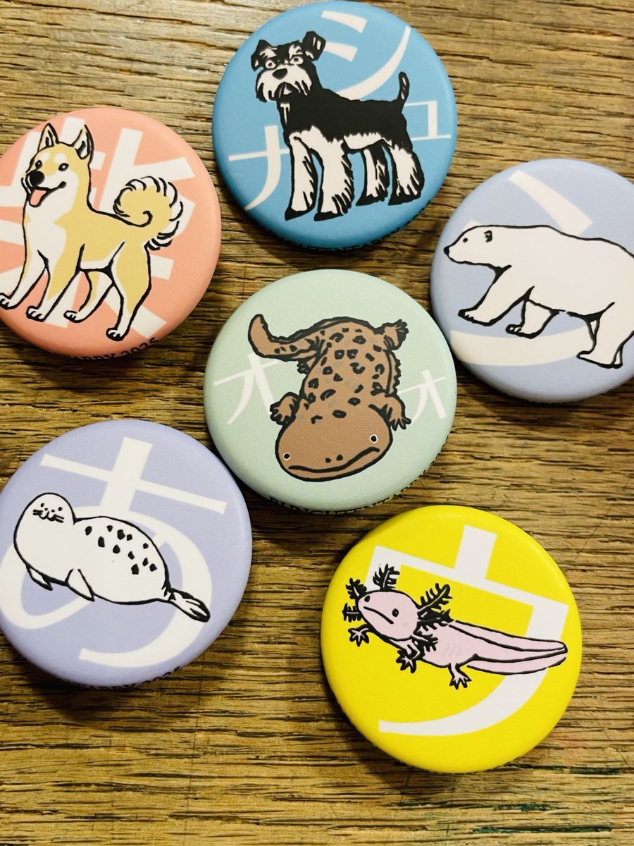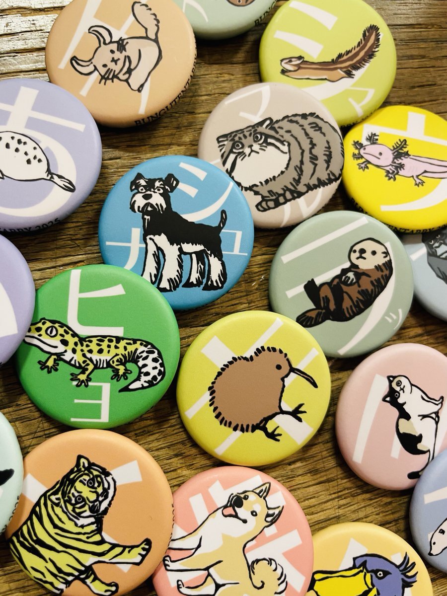 普段店で押している消しゴムはんこをミニ缶バッジにしました。今週末に1,000円以上のお買い物で全20種からぜひお一つ。どうぞよろしくお願いいたします。 #西荻茶散歩 pic.x.com/yMqYPdzHuo