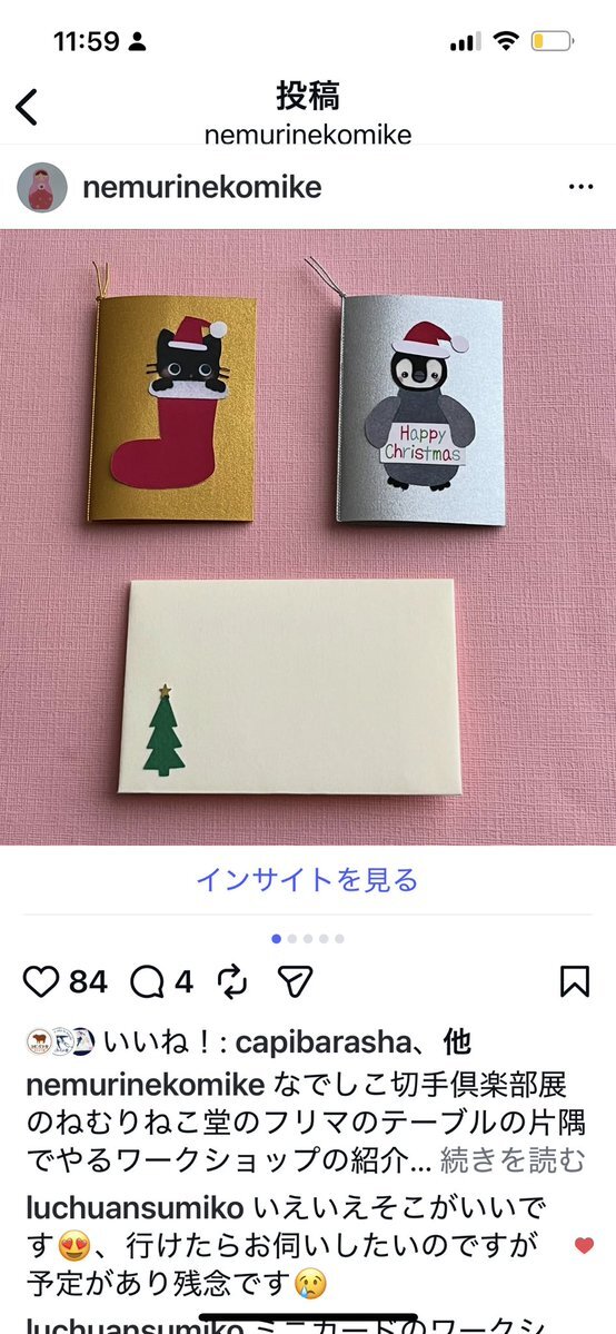 いつもの簡単すぎるミニカード作りもできます。 カット済みのパーツを貼るだけです。 ミニカードはクリスマスプレゼントにちょっと添えるのにあると便利ですよ。 ミニ封筒付きで一つ150円です。 同じワークショップをotegamiフリマ でも行います。 #西荻窪郵便局 #西荻茶散歩 pic.x.com/oFY14SxmXk