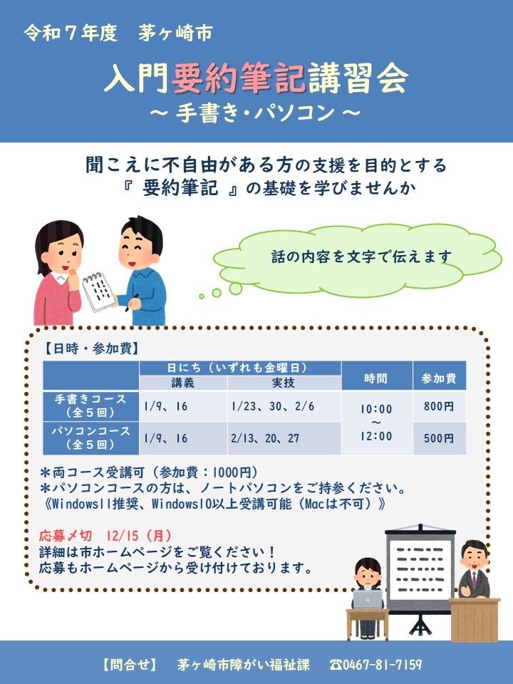 【お知らせ】聞こえに不自由がある方に、会話や講義等の内容をその場で文字で伝える「 #要約筆記 」の手法を学ぶ「入門要約筆記講習会」を2026年1月9日(金)~開催します。申込は12月15日(月)まで。 詳細は、city.chigasaki.kanagawa.jp/shogai/1048575… #ともに生きる #聴覚障がい #高齢者 #手話 pic.x.com/HJboVnXHhf