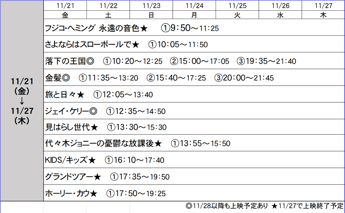 【11/21~11/27上映スケジュール】 #フジコ・ヘミング #さよならはスローボールで #落下の王国 #金髪 #旅と日々 #ジェイ・ケリー #見はらし世代 #代々木ジョニーの憂鬱な放課後 #KIDS #キッズ #グランドツアー #ホーリー・カウ pic.x.com/0rEvbeSvVZ