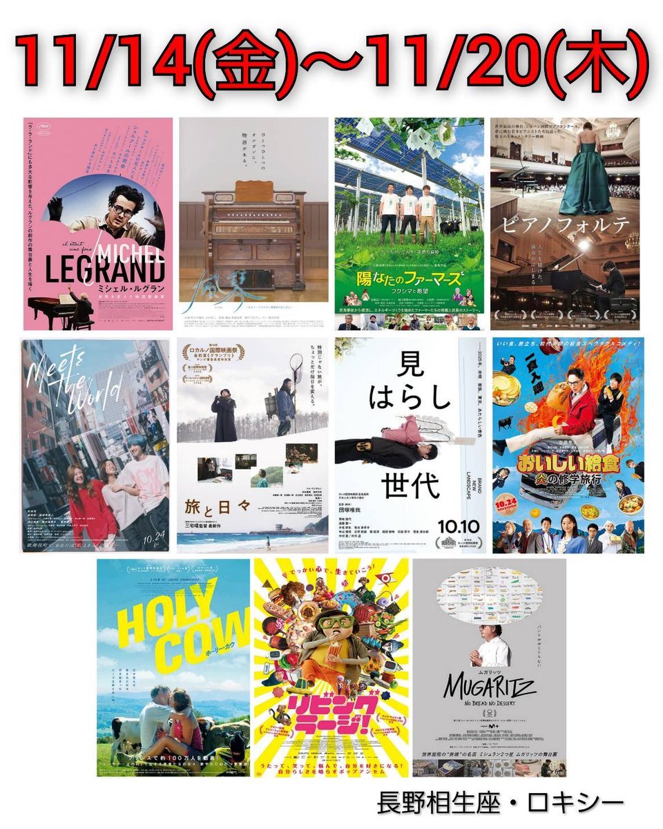 【11/14㊎~11/20㊍の情報案内】 こんばんは🌙 🆕明日11/14㊎から新たに6作品公開🎬 ・『#風琴 ~あるリードオルガン修復家のあしあと~』 ・『#陽なたのファーマーズ フクシマと希望』 ・『#見はらし世代 』 ・『#ミシェル・ルグラン 世界を変えた映画音楽家 』 ・『#リビング・ラージ !』 x.com/aioiza_roxy/st…