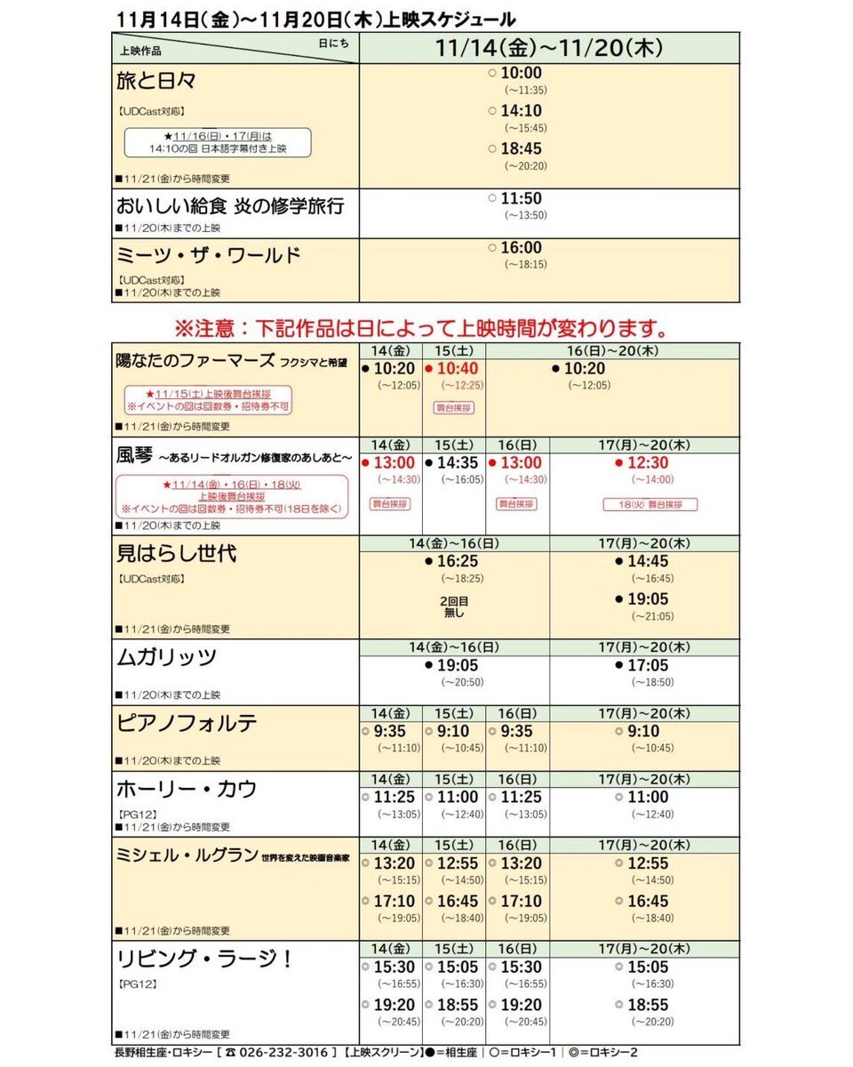 11/14(金)~11/20(木)の上映作品&上映時間 #風琴 ~あるリードオルガン修復家のあしあと~🆕 📌11/14(金)・16(日)・18(火)の3日間、上映後に舞台挨拶あり❗️ #陽なたのファーマーズ フクシマと希望🆕 📌11/15(土)上映後に舞台挨拶あり❗️ #見はらし世代 🆕 #ミシェル・ルグラン 世界を変えた映画音楽家 pic.x.com/ocDz1UpJ9c