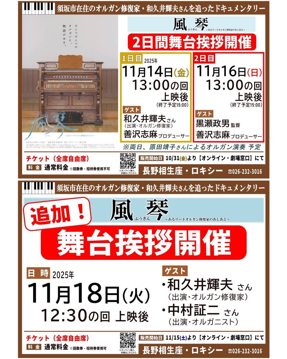 11/14(金)~11/20(木)の上映作品&上映時間 #風琴 ~あるリードオルガン修復家のあしあと~🆕 📌11/14(金)・16(日)・18(火)の3日間、上映後に舞台挨拶あり❗️ #陽なたのファーマーズ フクシマと希望🆕 📌11/15(土)上映後に舞台挨拶あり❗️ #見はらし世代 🆕 #ミシェル・ルグラン 世界を変えた映画音楽家