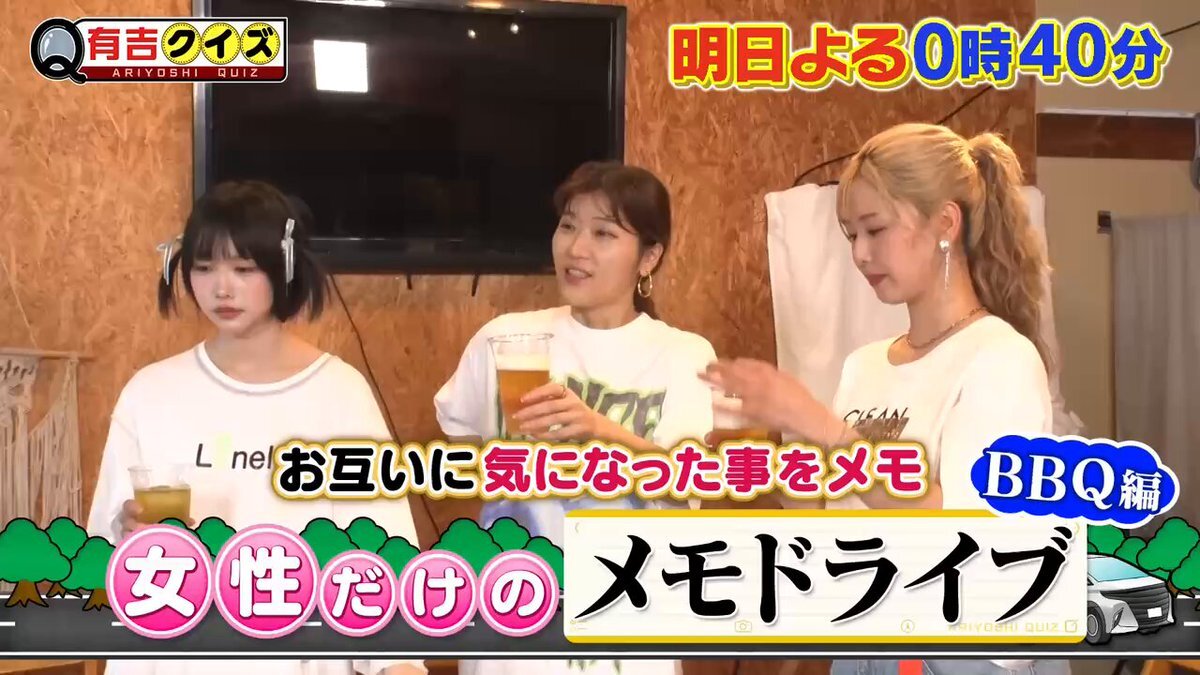 明日よる0時40分から #有吉クイズ 『女性だけのメモドライブ』完結編🚗🩷 いよいよBBQスタート🍖 しかし…空気をかき乱す大事件ぼっ発で全員のメモが止まらない✍️ #有吉弘行 #あのちゃん #森香澄 #朝日奈央 #3時のヒロイン福田 #ヒコロヒー #大家志津香