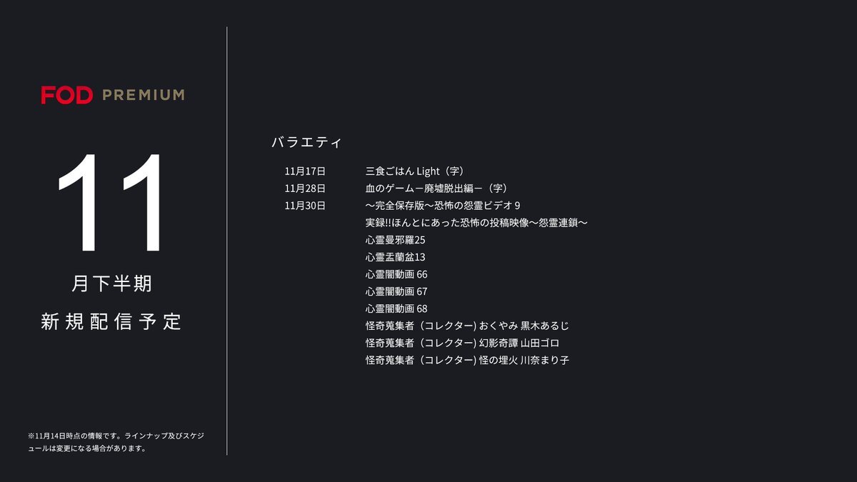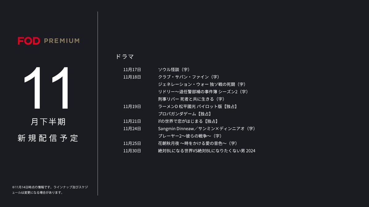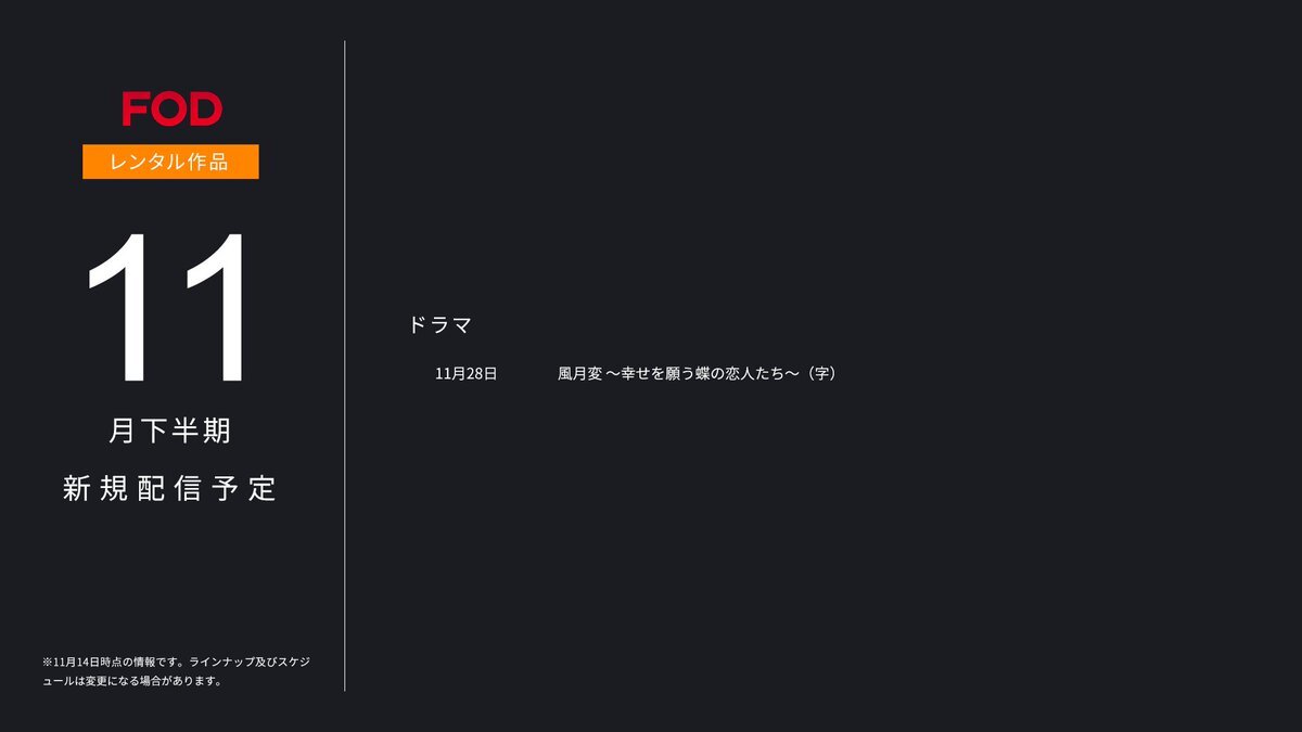 🆕#FOD 2025年11月下半期新規追加作品🆕 <#FODプレミアム>#見放題 11/16~11/30配信開始予定の作品です。 ※スケジュール変更の可能性も有 ▷ドラマ ※全て独占作品 『#ラーメンD 松平國光 パイロット版 『#プロパガンダゲーム』 『#ifの世界で恋がはじまる』 <レンタル> ▷ドラマ 『#風月変 pic.x.com/SuKPV0An2w