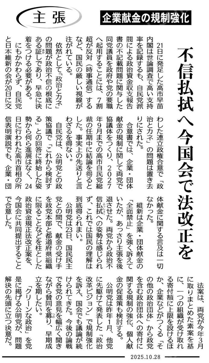 🔴主張 企業献金の規制強化!不信払拭へ今国会で法改正を! #企業献金 #規制強化 #公明新聞電子版 2025年10月28日付 komei.or.jp/newspaper-app/ pic.x.com/CMG8uYXqIa