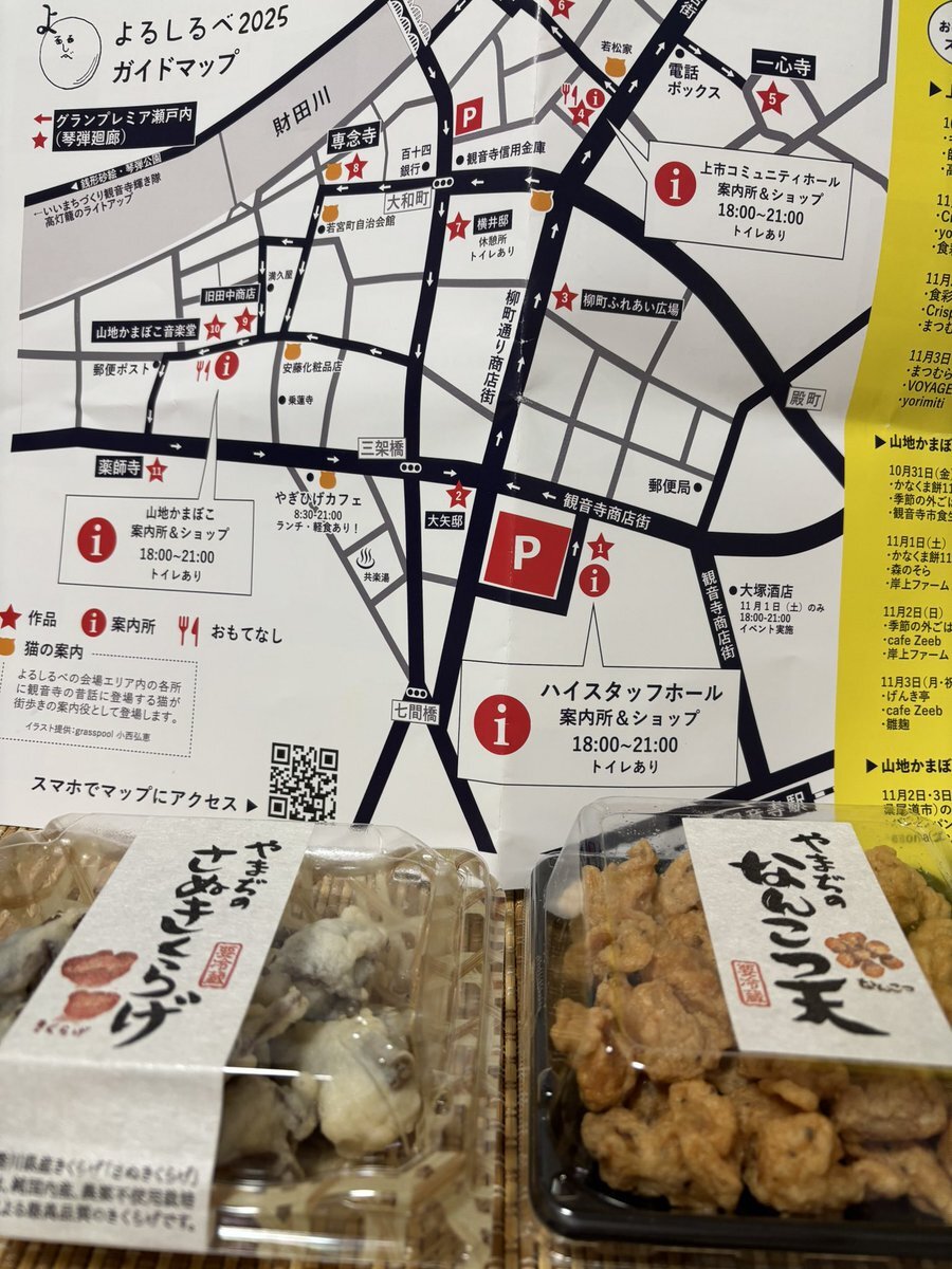 #よるしるべ に行って来ました🌙 #かなくま餅11号線 のイレブンさんが出店けど間に合わず 売切れてました🥲(写真撮り忘れ😂) でも #山地蒲鉾 のなんこつ天きくらげ天ゲット✌️ 今日も出店してるので間に合えば再挑戦😊 #観音寺商店街 pic.x.com/SUhBiK2mpJ