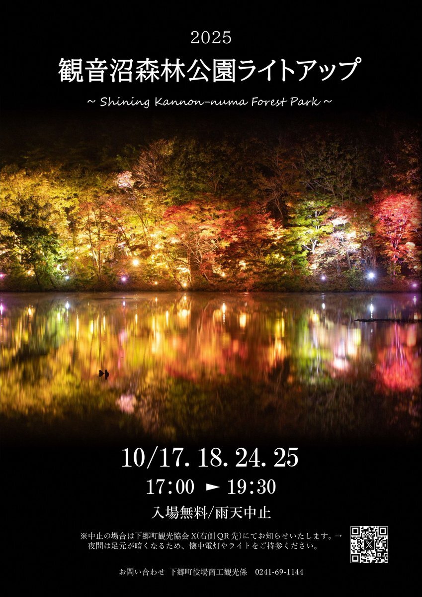 📣いよいよ今週末開催✨ 観音沼森林公園ライトアップ2025 紅葉の名所 #観音沼森林公園 が光に包まれる特別な4日間🍁💡 水面に映る幻想的な光景をお楽しみください。 📅10/17(金)・18(土)・24(金)・25(土) 🕗17:00▶19:30 ※夜間は足元が暗くなります。ライトをご持参ください。 #下郷町 #紅葉