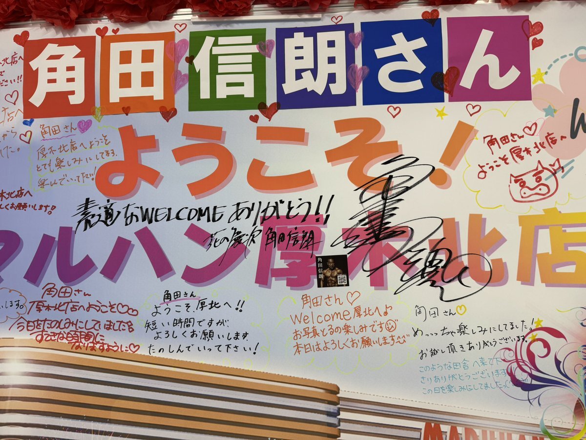 またまたこんにちわ´●.̫●`❤️🔥 角田さんご来店されました( *ˊᵕˋ*)♡ とても✨神対応✨でした👏🏻 𝐖𝐞𝐥𝐜𝐨𝐦𝐞POPに お返事メッセージまで 書いてくださいました✨⁝(ᵒ̴̶̷᷄⌑ ᵒ̴̶̷᷅ )⁝ 店内もたくさんのお客様が 並ばれてとても大盛り上がりでした😆 #マルハン #角田信朗 #週末 pic.x.com/VgHBQ46Apo