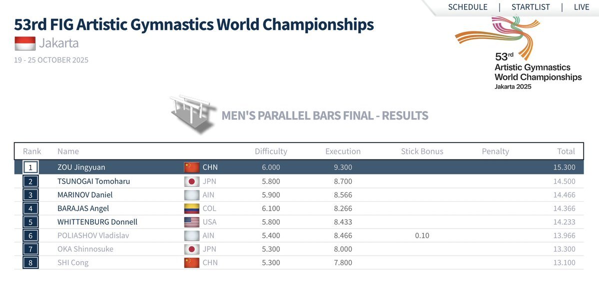 《世界体操2025》 【種目別決勝🇯🇵平行棒結果】 / #角皆友晴 選手 銀メダル🥈獲得! おめでとうございます!👏✨✨ \ 🥇ZOU Jingyuan🇨🇳15.300 🥈角皆友晴🇯🇵14.500 🥉MARINOV Daniel 14.466 : 7位 岡慎之助🇯🇵13.300 gym.swisstiming.com/2025/Artistic-… pic.x.com/VqcE2DvBcW