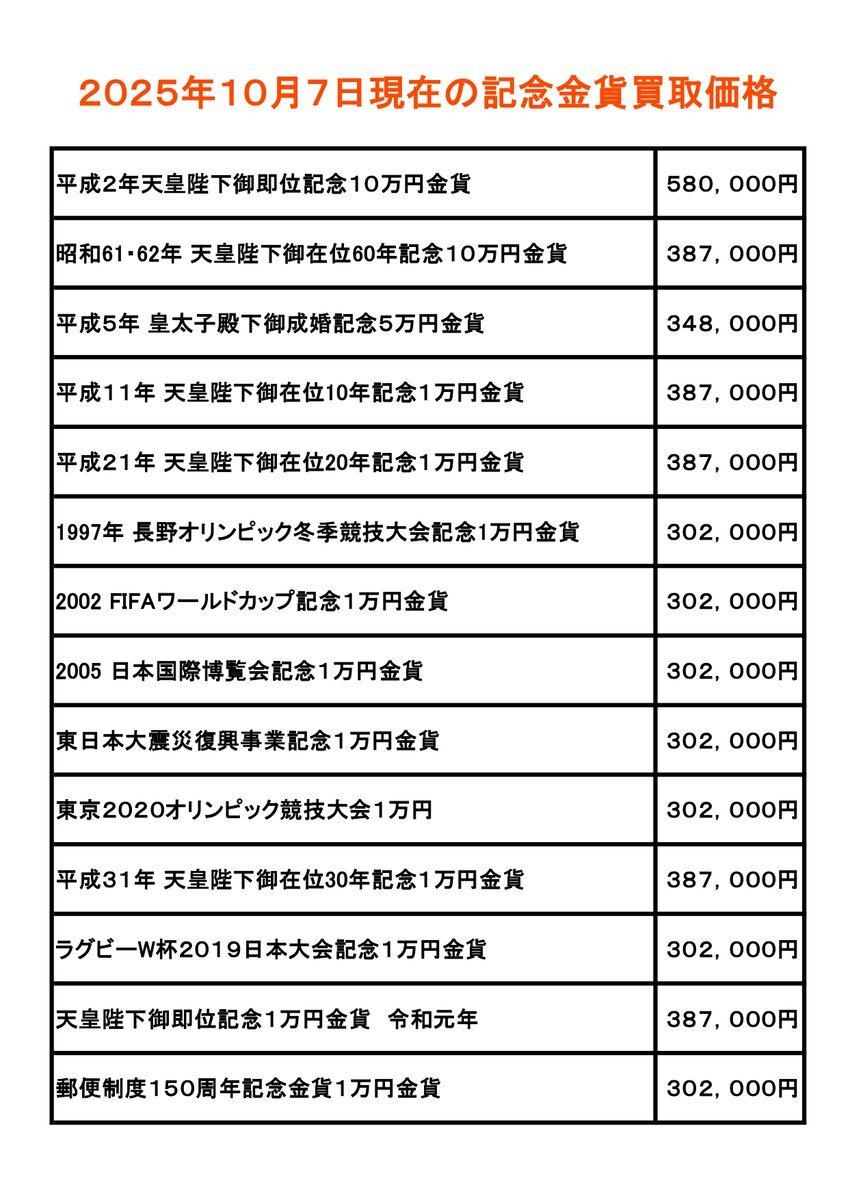 記念金貨買取価格一覧(10/4現在)を更新しました #記念金貨 #金貨 #金買取 #貴金属買取 maruichi-sakado.com/archives/13319 pic.x.com/TjncaRKaIl