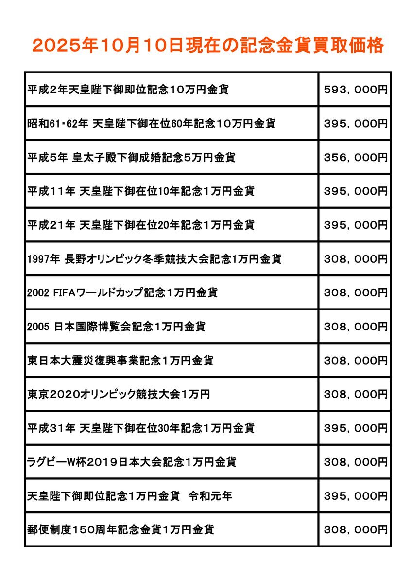 記念金貨買取価格一覧(10/14現在)を更新しました #記念金貨 #金貨 #金買取 #貴金属買取 maruichi-sakado.com/archives/13319 pic.x.com/JetP7ekgaA