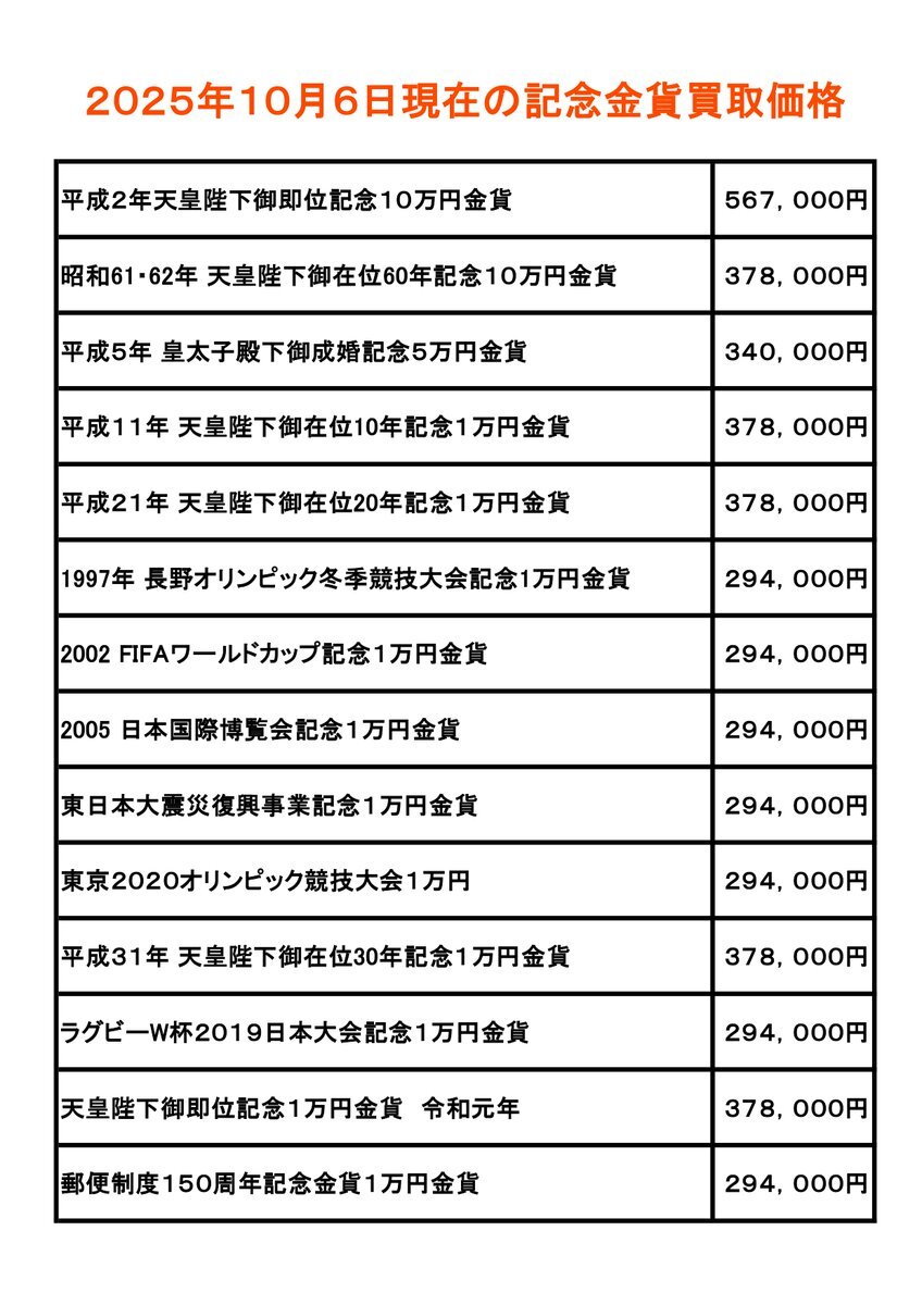 記念金貨買取価格一覧(10/6現在)を更新しました #記念金貨 #金貨 #金買取 #貴金属買取 maruichi-sakado.com/archives/13319 pic.x.com/tUKwvNplgz