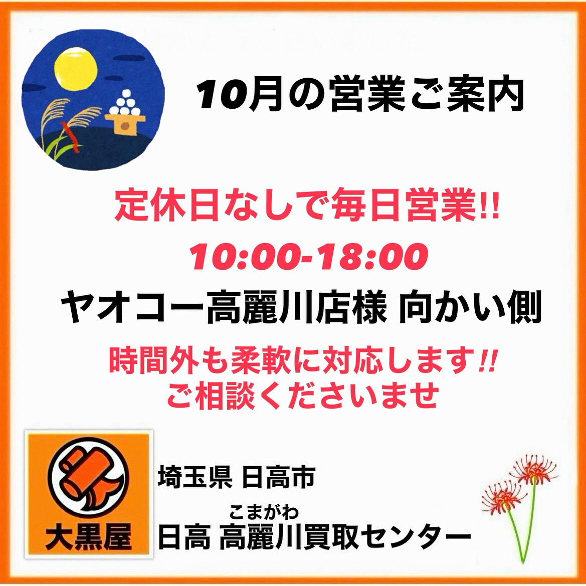 10月の営業予定ご案内 ★定休日なしで毎日営業 Tel 042-984-3377 10:00-18:00 ★オレンジ色の看板 ヤオコー高麗川店様 向かい側 # #貴金属 #金買取 #金貨 #記念金貨 #プラチナ #ブランド品 #買取 #リサイクル #高麗川 #日高市 #毛呂山 #飯能 #武蔵高萩 pic.x.com/dAhmBrx23m