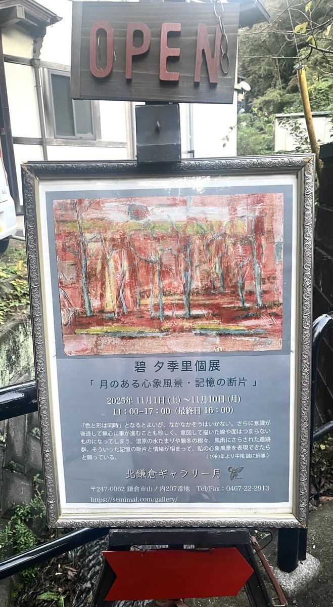 【碧夕季里展】月のある心象風景・記憶の断片 が始まりました! オープンからお客様もいらっしゃり、 賑やかにスタートです。 会期は11/10(月)まで @北鎌倉ギャラリー月 semimal.com/gallery #碧夕季里 #油絵 #心象風景 #記憶の断片 #北鎌倉ギャラリー月 pic.x.com/uE6n4CjfNp