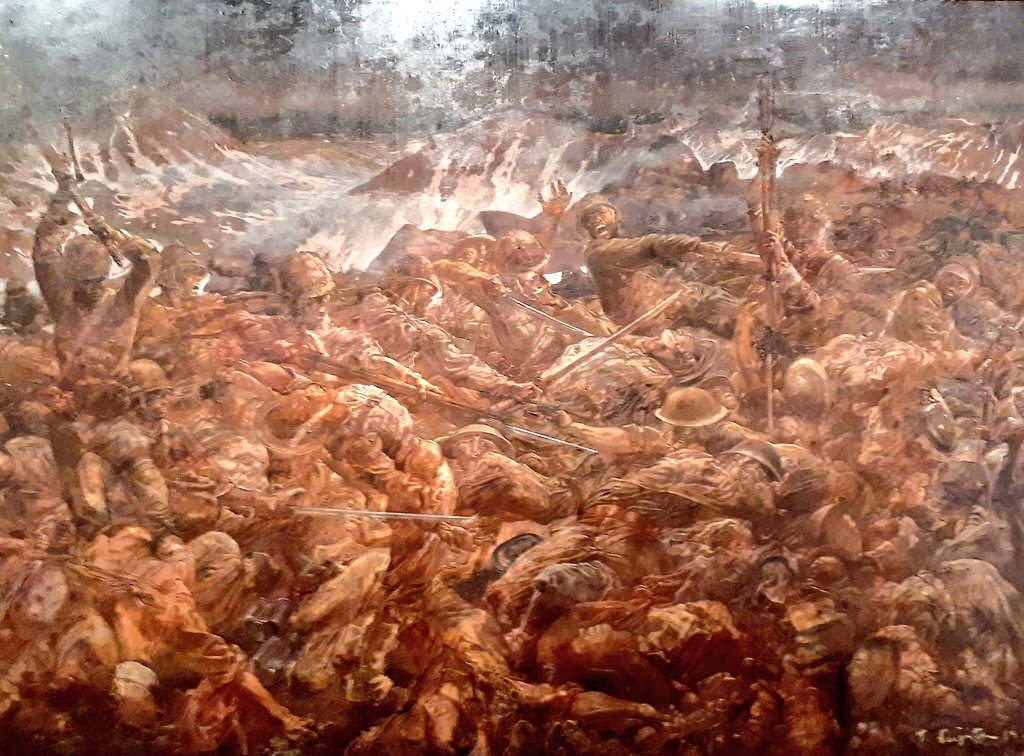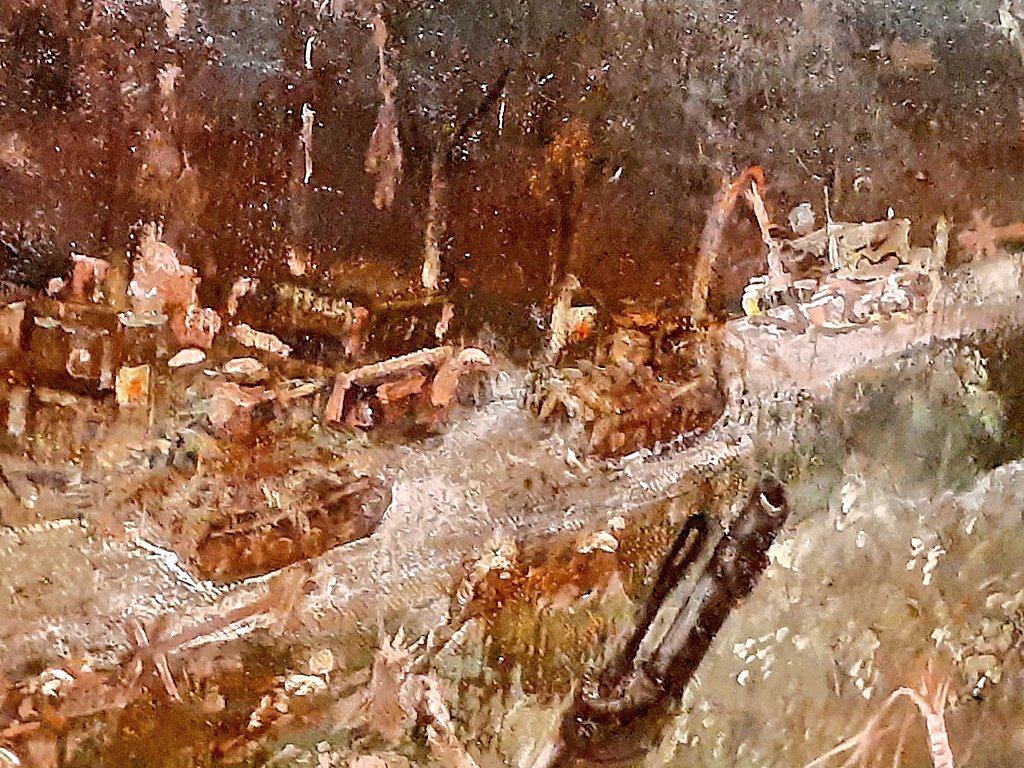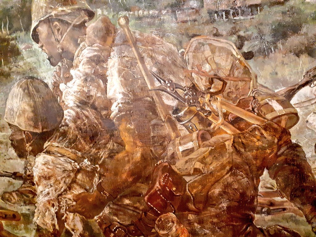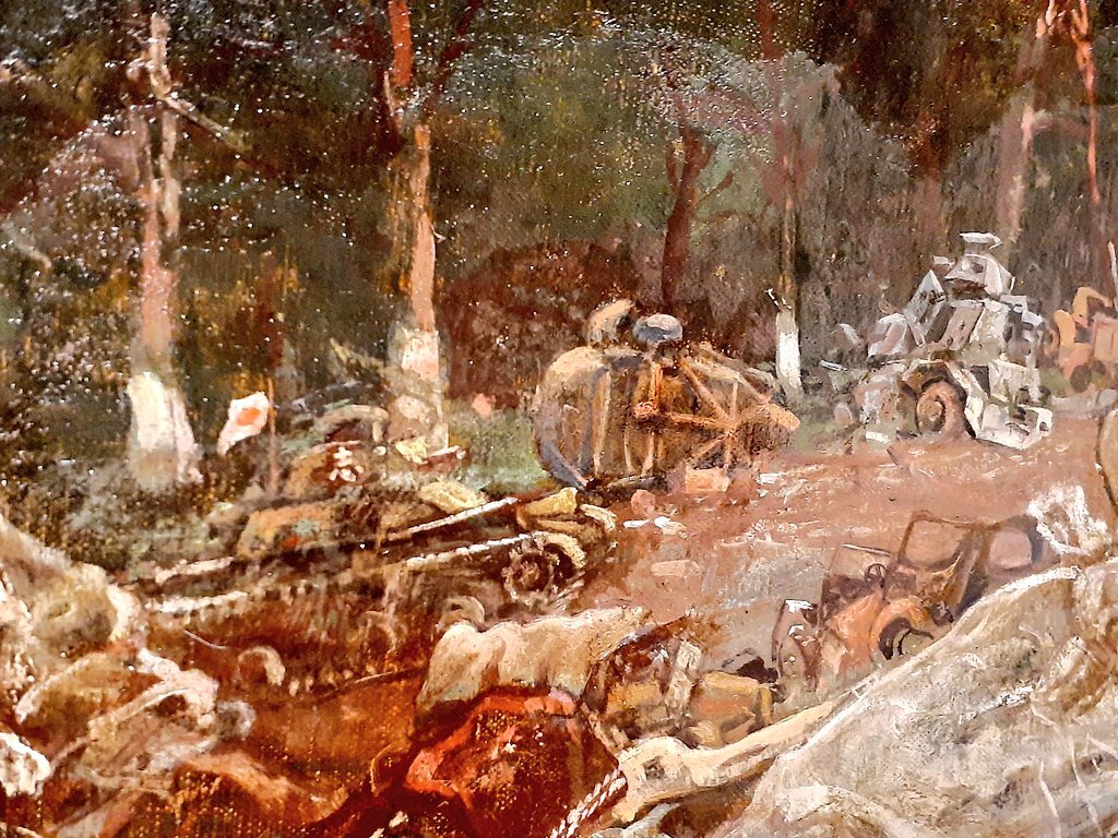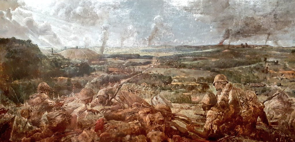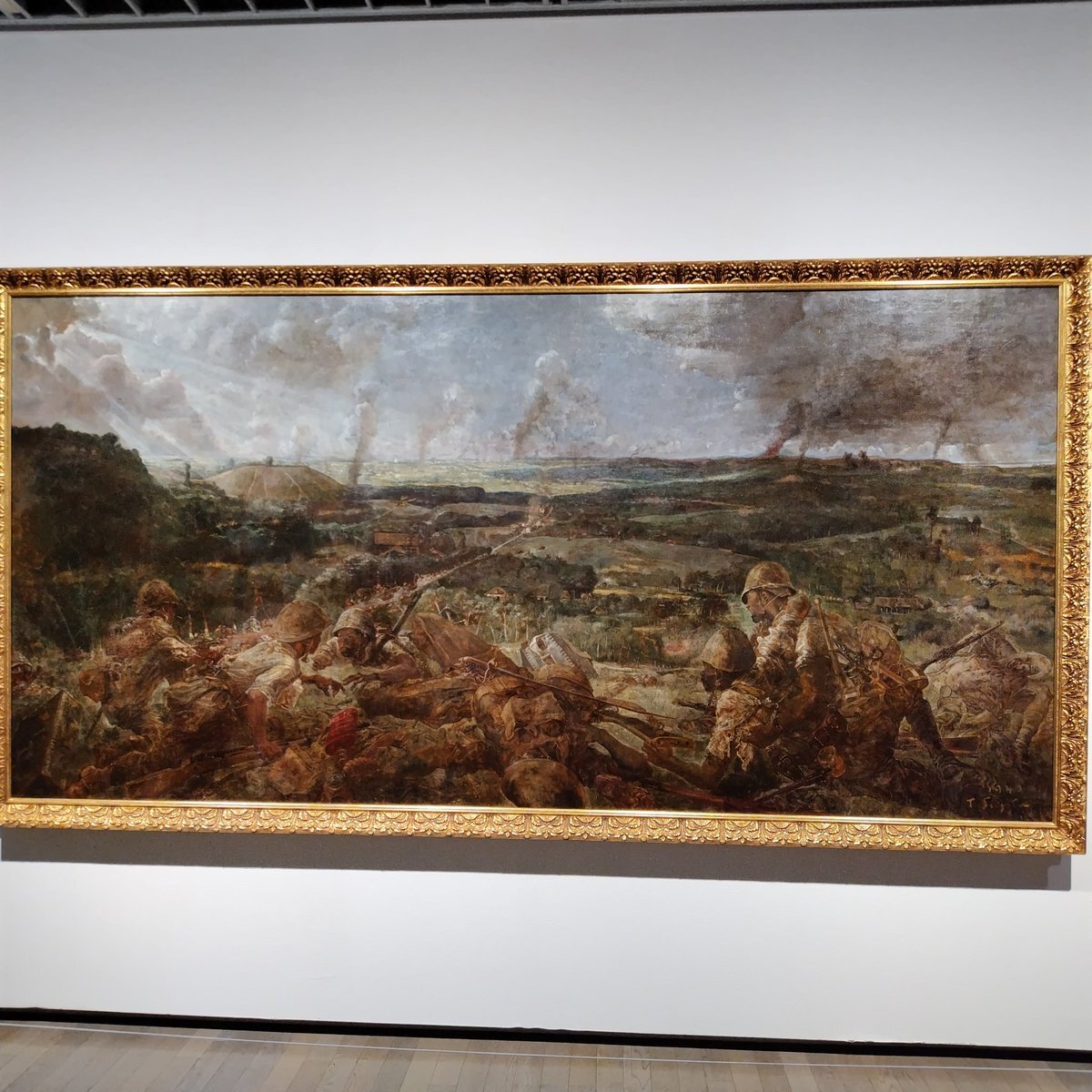#東京国立近代美術館 #記録をひらく記憶をつむぐ 藤田嗣治 シンガポール最後の日(ブキ・テマ高地) ブキ・テマ高地の占領を描いたものですが傷ついた兵士が遠く離れたシンガポールの市街地を見詰めている姿に哀愁を感じる。自分も一緒に見詰めたらシンガポールに続く街道の凄まじい状況が見えてきた… pic.x.com/Xh91MNUOv1