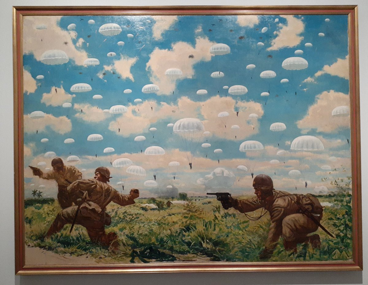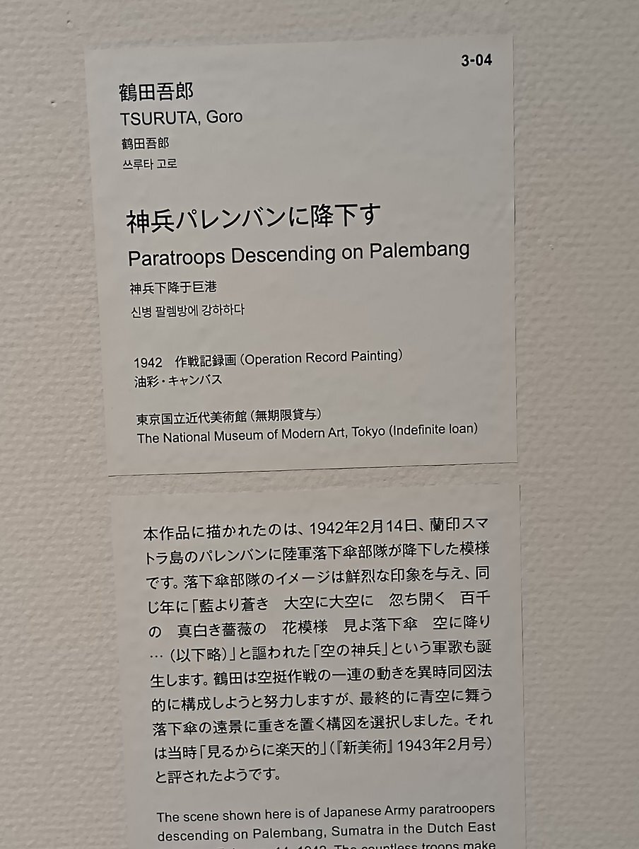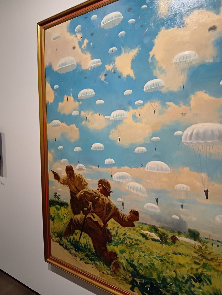 #東京国立近代美術館 #記録をひらく記憶をつむぐ 鶴田吾郎 神兵パレンバンに降下す これも生で見たかったものです。勇ましいと感じる前に何と申しましょうか…何処までも純粋な透き通った、もの凄く明るく美しい印象を受けました。 pic.x.com/743BfDIsg9