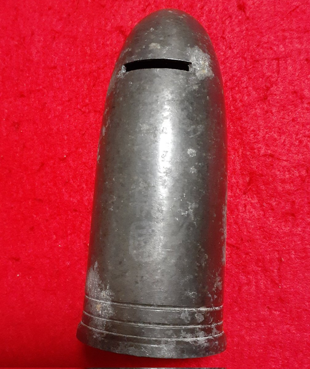 服部時計店謹製砲弾型貯金箱。店主さんは砲弾型はしているがどうかなあと仰っていたが紛れもない砲弾型貯金箱である。愛国心があれば貯金報國と書かれているのが見えてくる。入手時に何の金属だろうと思ったが調べてみたらマグネシウムの屑地金を鋳造したもので戦中の金属回収には該当しないそうです。