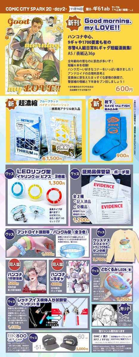 💛おしながき💙 11月16日(東京)COMIC CITY SPARK 20-day2- スペース番号【東8/ギ61ab】 サークル「へこめ!鳩尾…。」 新刊1点&新作グッズ3点📙既刊2点ほかグッズ色々あります!サムネだと上下見切れてるので拡大してご確認ください🙏 DBHの漫画とグッズをハンコナのコスプレ2人組が頒布します👮👮 x.com/murockyou/stat…