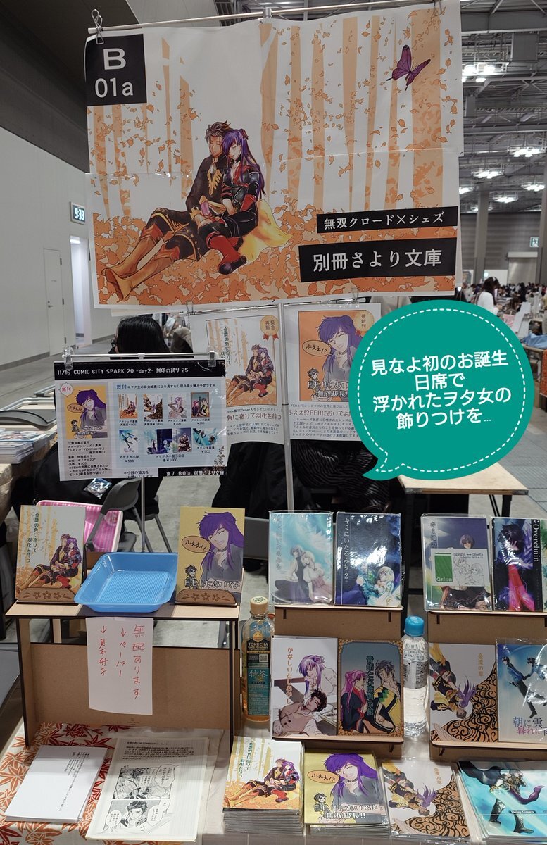 11/16東京ビッグサイト 刻印の誇り25 B01a 別冊さより文庫 無双風花雪月クロード✕シェズ♀ クロシェズ漫画とグリジタ小説と画集とベリジタ本も少数置いてあります! 無配ペーバーや冊子もあるよ! #設営完了 pic.x.com/JGegqrsMOO