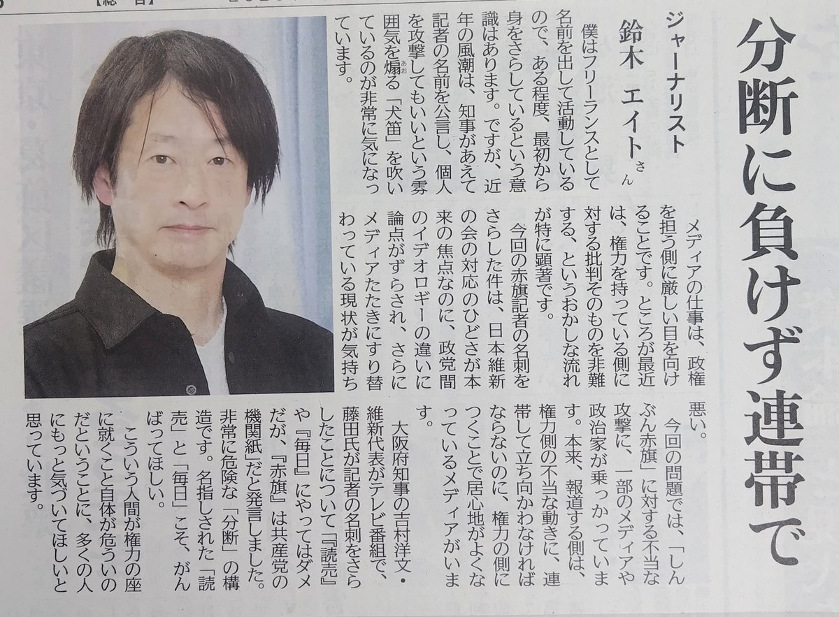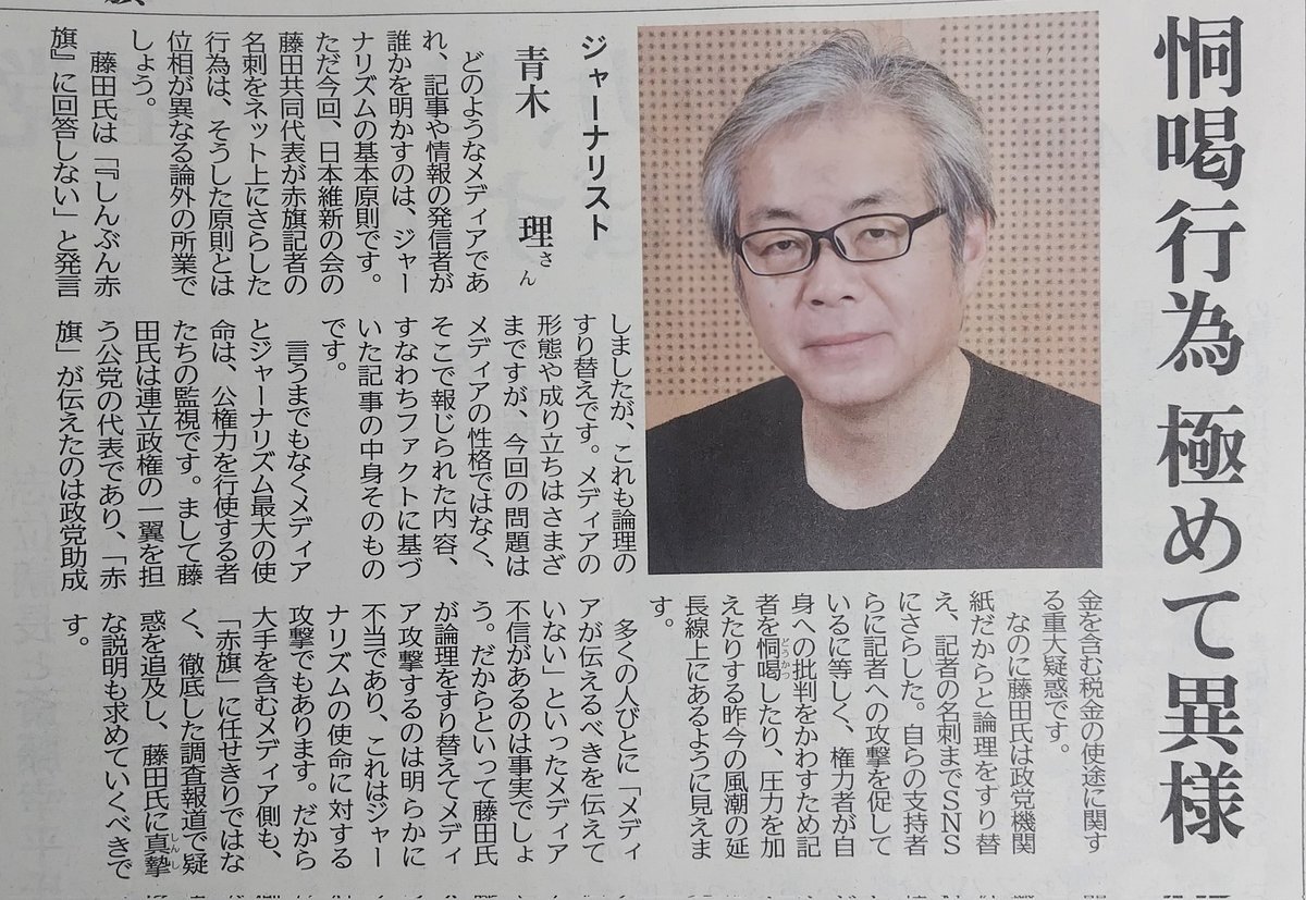 許すな政権与党の報道妨害 「日曜版」記者への攻撃/恫喝行為 極めて異様/ジャーナリスト 青木理さん|しんぶん赤旗|日本共産党 jcp.or.jp/akahata/aik25/… #青木理 #藤田文武公金還流疑惑 #藤田文武名刺さらし問題 #許すな政権与党の報道妨害