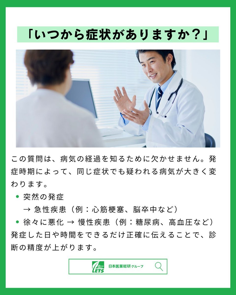 病院で診察を受けるとき、 「なぜそんなことを聞かれるんだろう?」 と思う質問をされることがあります。 実はそれらの質問には、 正確な診断や安全な治療につなげるための 重要な意図があるのです。 👇よくある質問の意味をわかりやすく解説💡 #診察 #質問 pic.x.com/ONgXfV1KyV