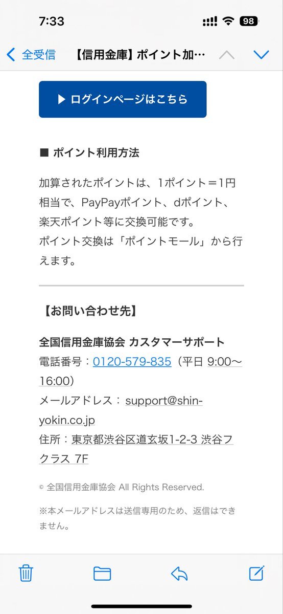 【注意喚起⚠️】 「信用金庫」を名乗る怪しいメール ・ポイント加算のお知らせ ・ログインはこちら、の青いボタン ・個人情報の入力誘導 ・差出人アドレスが不自然 完全にフィッシングの典型パターン 心当たりがないメールのリンクは絶対に押さないで⚠️ #フィッシング詐欺 #迷惑メール #詐欺注意 pic.x.com/8tYx5uyXI9