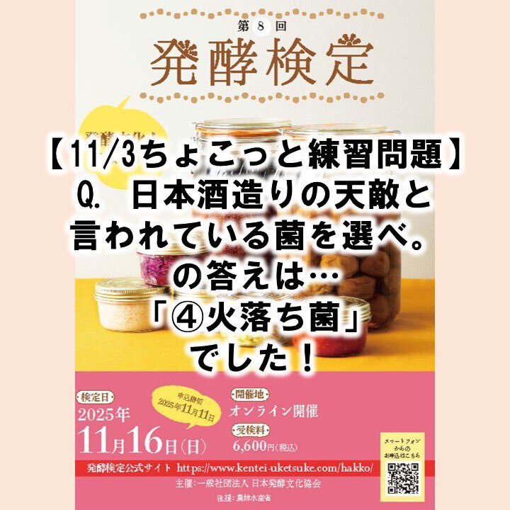 【11/3ちょこっと練習問題】 Q. 日本酒造りの天敵と言われている菌を選べ。 の答えは… 「④火落ち菌」でした! 【11/16開催 第8回発酵検定申込11/11まで!】 hakkou.or.jp/workshop/cours… #発酵 #日本発酵文化協会 #発酵検定 #オンライン #試験 #検定 #資格 pic.x.com/fIH7xxRkfp