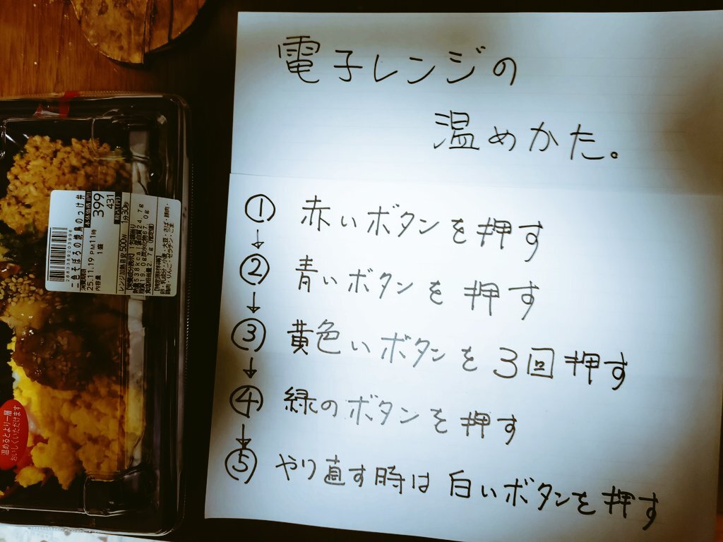 自分が仕事で出ている間の母親の昼ご飯は市販の弁当買ってきておくんだけど… レンジの操作方法書いておいてボタンの色と回数だけで済むようにしておいても自分ではとても作れないらしい。 リサイクルショップ行ってダイヤル式の古い電子レンジ買ってきた方がいいのかな?😟 #認知症介護 pic.x.com/uyurn1CZ3l