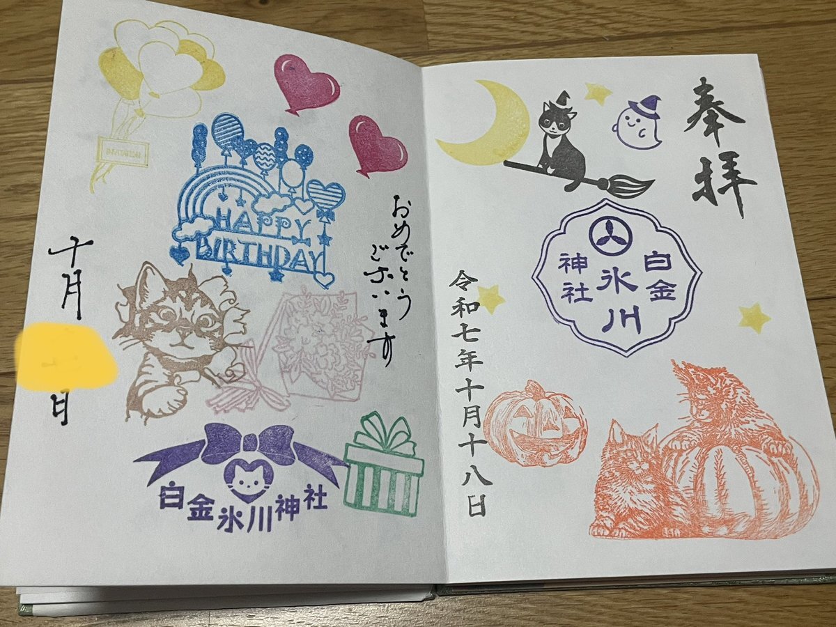 白金氷川神社に参拝⛩️ 誕生月とお伝えしたらめちゃくちゃ可愛い御朱印を拝受することが出来ました😊 ハロウィンバージョンも可愛い過ぎです #白金氷川神社 #誕生日御朱印 #御朱印 pic.x.com/neN2qVZwMX