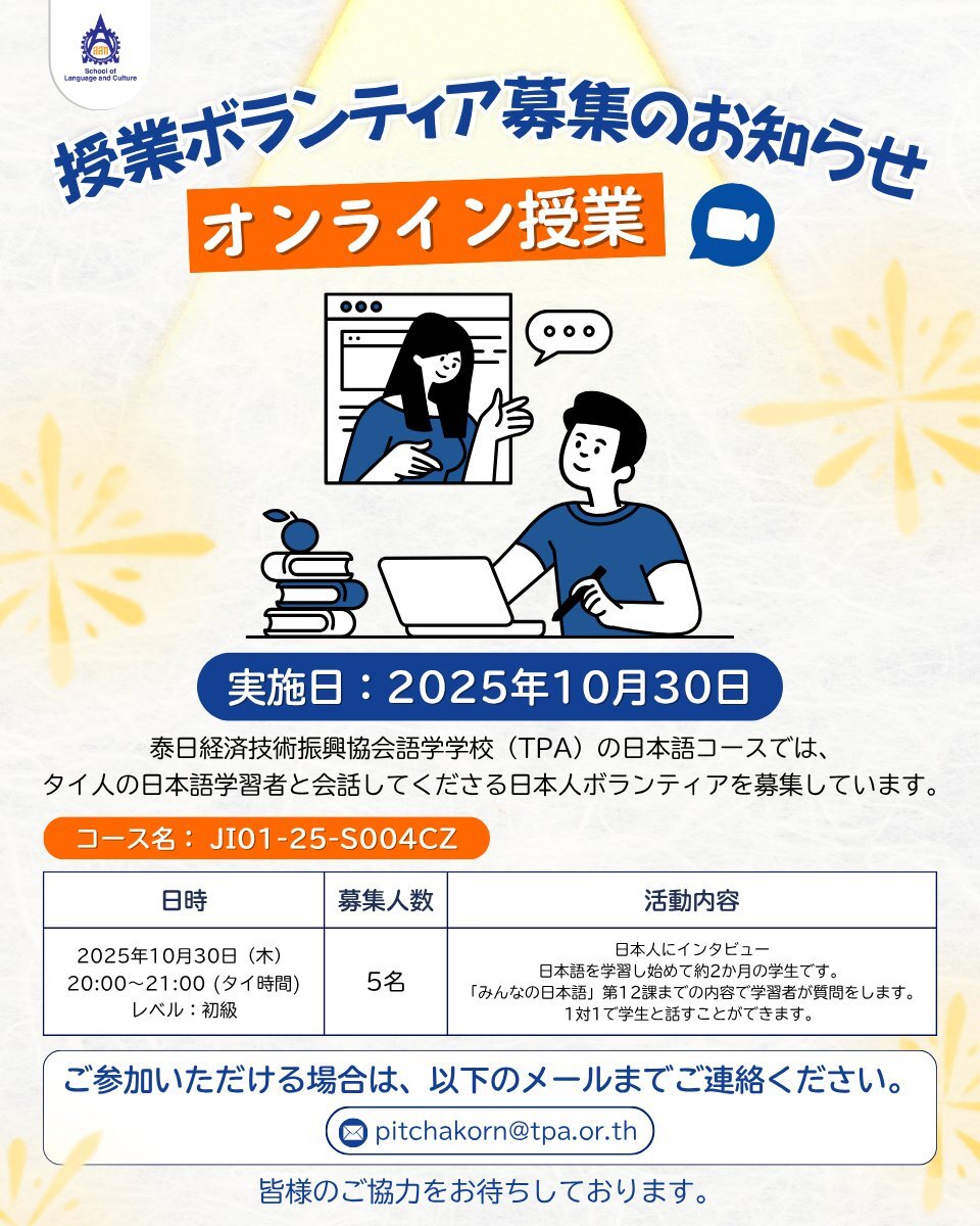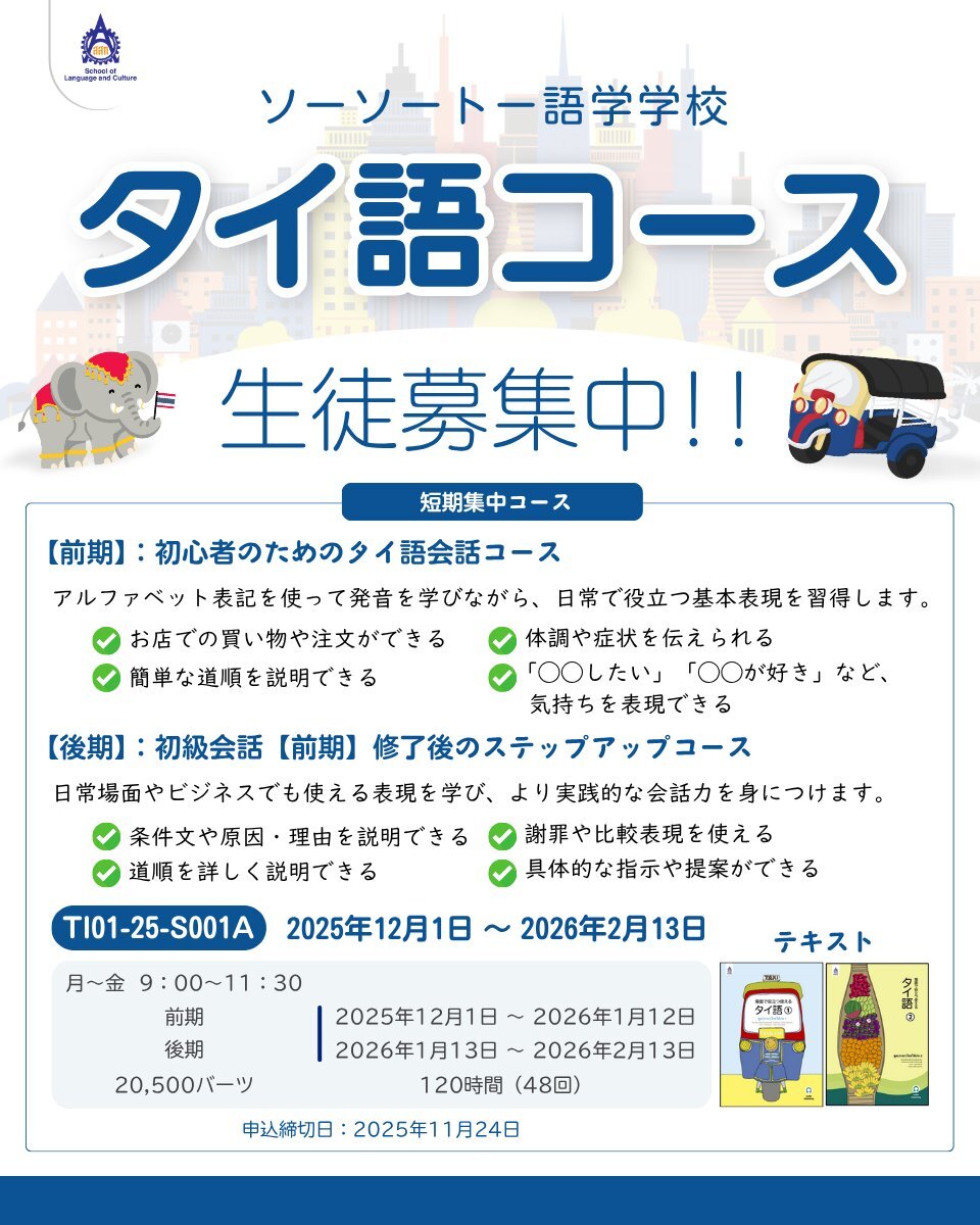 🇹🇭タイ語コース #生徒募集中📣 基礎から応用まで、しっかり勉強したいという方におススメ! アルファベット表記で標準的な発音のし方、基本的な日常会話を習得します。 詳しくはこちら👉j.tpa.or.th/slc/course.php… #バンコク #タイ #タイ語 #語学学校 #タイライフ #タイ語教室 #タイ語学習 #タイ語勉強 pic.x.com/GdL3YvMtRa