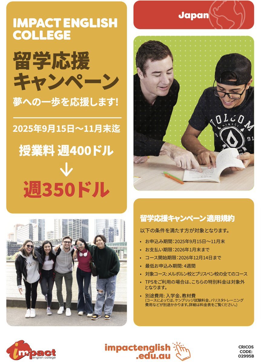 インパクト・イングリッシュ・カレッジ、 ゲリラキャンペーン延長決定🎉 10月末まで予定だった期間限定キャンペーンが、 11月末まで延長に🤩 ⚠️12月以降のキャンペーン再延長はなし!!! #留学 #ワーホリ #語学学校 #英語 #キャンペーン #オーストラリア #メルボルン #ブリスベン pic.x.com/O8VK4W0MYJ