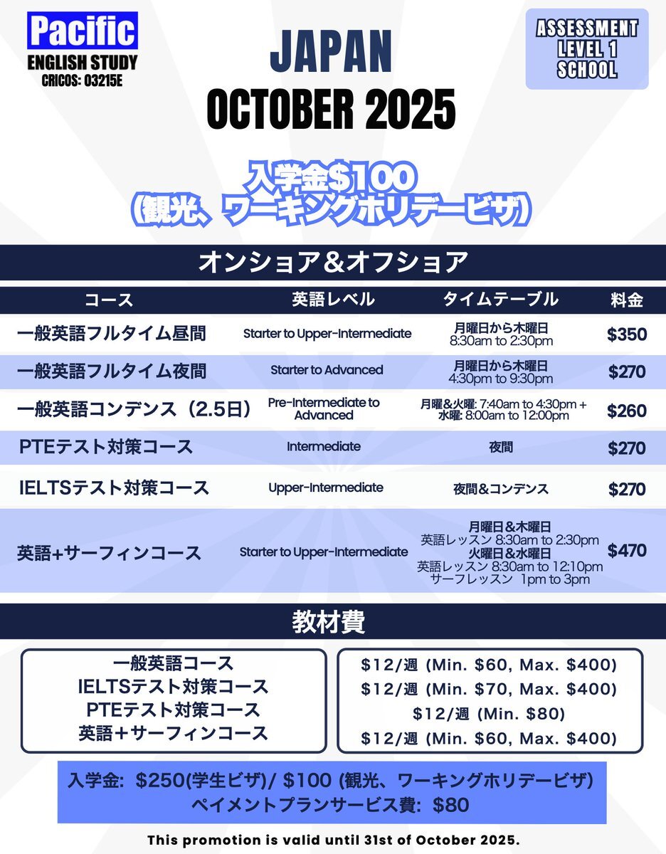 パシフィック・イングリッシュ・スタディ10月限定プロモーション発表! ゴールドコーストのビーチフロント校で費用抑えて通いたいなら2.5日/週のコンデンスコースもおすすめ😎 #オーストラリア #ゴールドコースト #サーファーズパラダイス #語学学校 #留学 #ワーホリ 👇🏽キャンペーン情報 pic.x.com/v21XehcScs