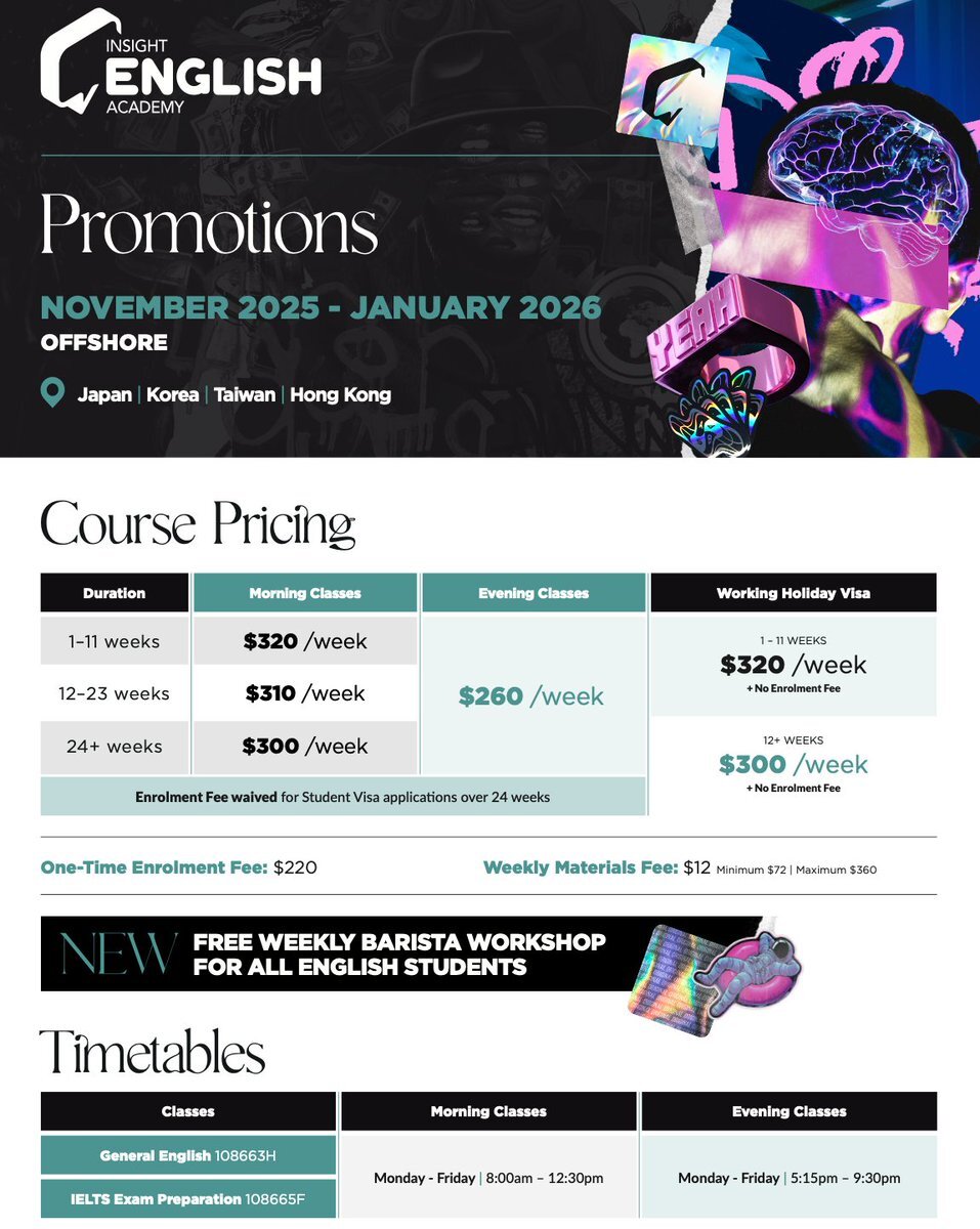 メルボルンの「インサイト・アカデミー」 最新キャンペーン公開!! 先月までのキャンペーン内容と変更なし🎊 2026年1月末までにお申し込みをされる方が対象🙌🏽 #オーストラリア #メルボルン #英語 #語学学校 #留学 #語学留学 #ワーホリ pic.x.com/76hXsBfL1a