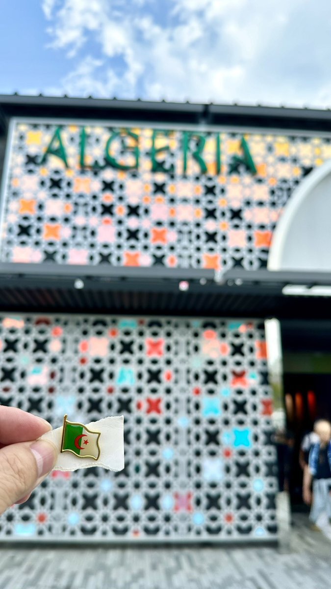 #誰もあげてないような万博写真をあげる #なんとなく万博の写真をあげる アルジェリア🇩🇿で 工芸品を拝見してたら 突然手渡しでいただいたピンバッジと パビリオン前で記念撮影🥳 台紙は手で千切ってた🤣 #万博 #EXPO #パビリオン pic.x.com/RoFH52jhUv