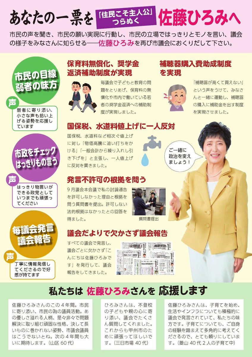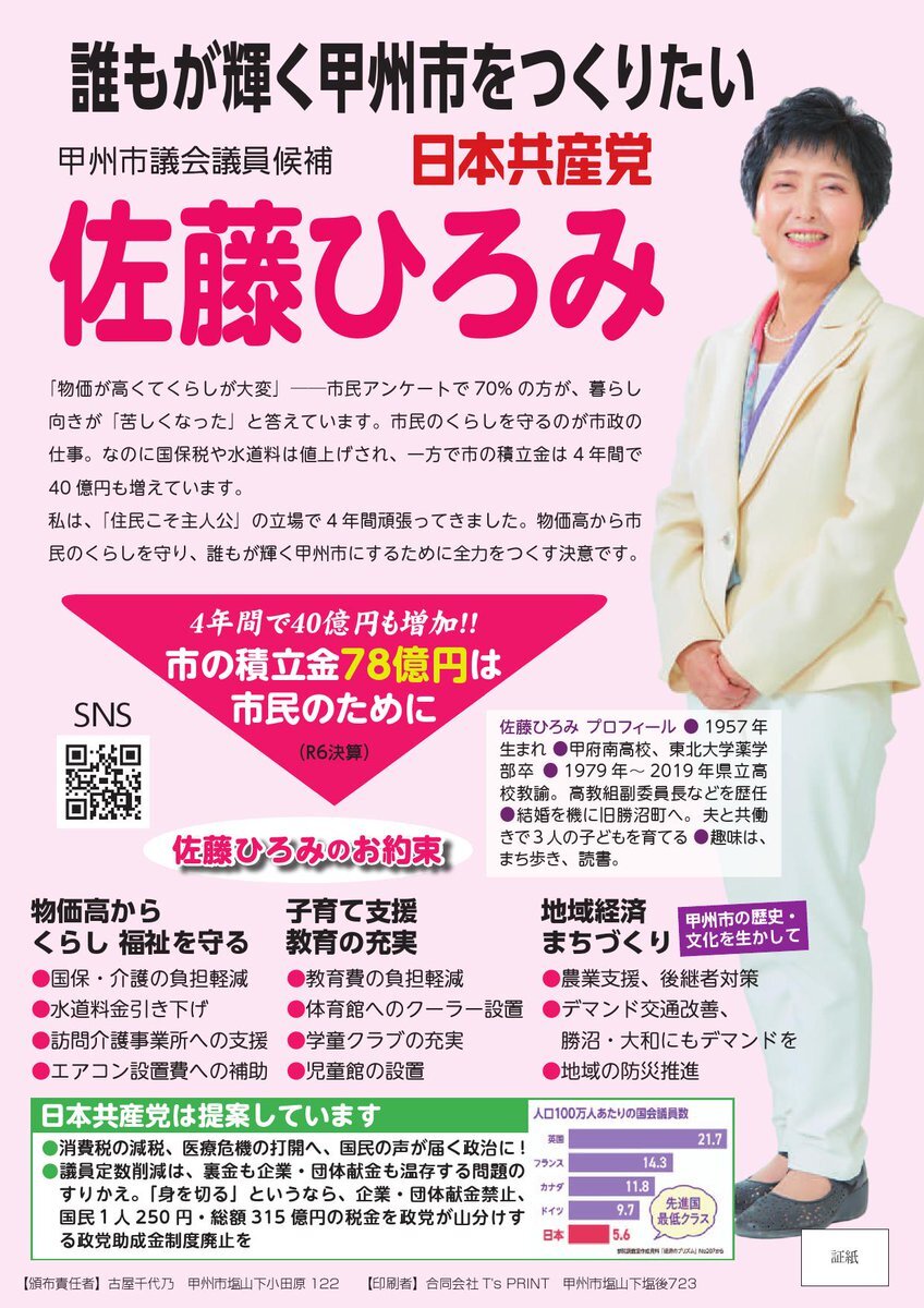 #甲州市 市民の命暮らし守る #日本共産党 #佐藤ひろみ 候補頑張って! 石破茂のお友達伊勢崎賢治氏を比例特定枠で参議院議員にしたれいわに騙されるな。 #甲州市議選 #甲州市議会議員選挙 #誰もが輝く甲州市を x.com/satohiro2423/s…