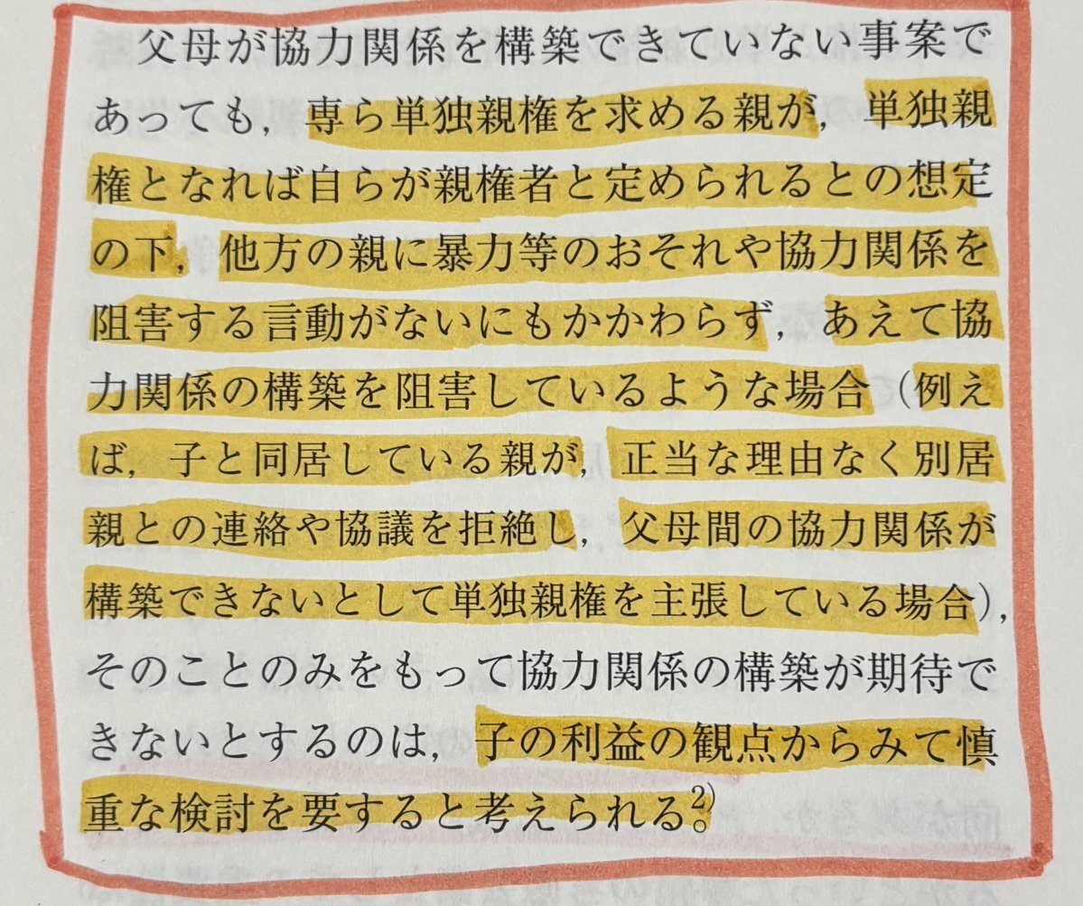 家庭の法と裁判58号、読んでいます。開始数ページで、どうかこの通りに実務も変わって欲しいと思える内容ばかりが記載されていました。別居親の皆さんに読んで、ご自身の事案に照らし合わせて欲しいです。 私が夫にされているこの行動が、協力義務違反と判断されることを、切に願います。