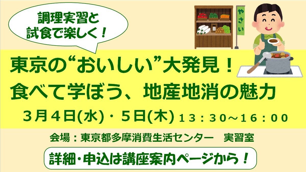 東京都 #多摩消費生活センター #食育 講座の受講者を募集中! 東京の #地産地消 の魅力を味わおう!#調理実習 と試食あり! 詳細・申込は講座案内ページから shouhiseikatu.metro.tokyo.lg.jp/manabitai/koza… #多摩消費生活センター #食育講座 #地産地消 #調理実習 pic.x.com/4U8VoXrfKt