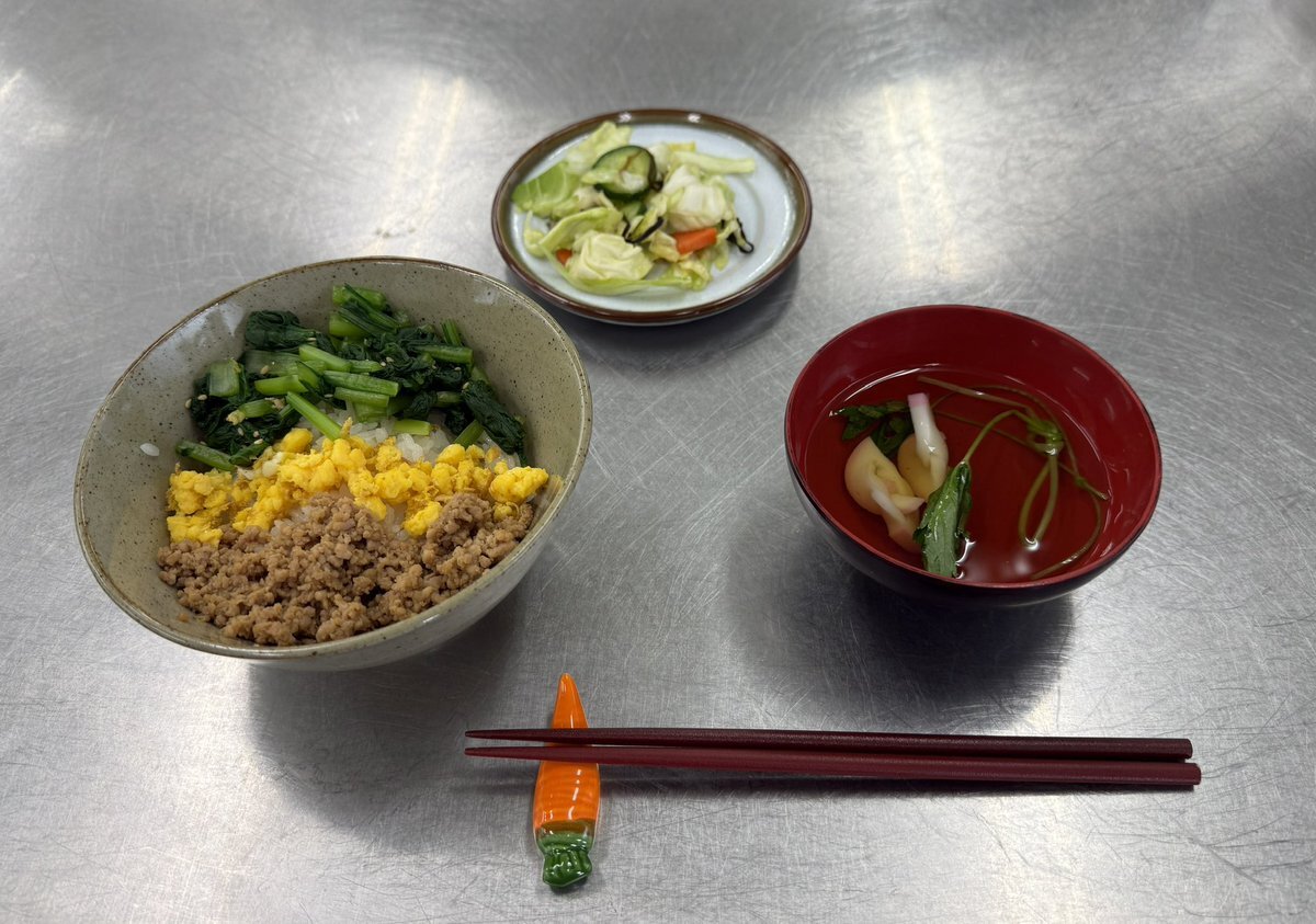 担任しているクラスの生徒が、家庭総合の授業で調理実習をしました。 今日のメニューは3色丼、すまし汁、キャベツの浅漬け。 どれも味も盛りつけも丁寧で、本当に美味しかったです。 一生懸命作ってくれた気持ちが伝わって、心もお腹も満たされました✨ ありがとう! #家庭総合 #調理実習 pic.x.com/Ryw7d6IUy1