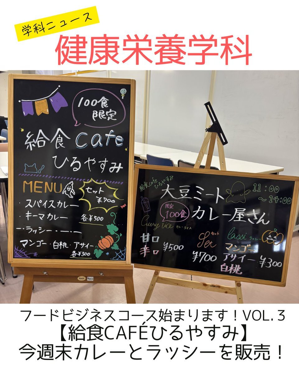 学科ニュース|「フードビジネスコース始まります!Vol.3」  【給食caféひるやすみ】 今週末カレーとラッシーを販売!|#健康栄養学科 sguc.ac.jp/event/foodnutr… #山陽学園短期大学 #岡山の短期大学 #大学生活 #調理実習 #栄養士 #栄養教諭 #製菓衛生師 #フードコーディネーター #フードビジネス pic.x.com/87OJpdXbbS