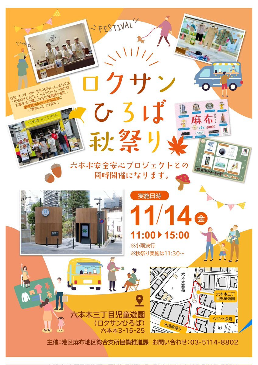 // ロクサンひろば秋祭り 開催します🍂🍄 \\ 📍日時:令和7年11月14日(金) 11時から15時まで 📍場所:六本木三丁目児童遊園 六本木3-15-25 キッチンカーや子ども用品おゆずり会など実施します☺️ city.minato.tokyo.jp/azabukyoudou/e…
