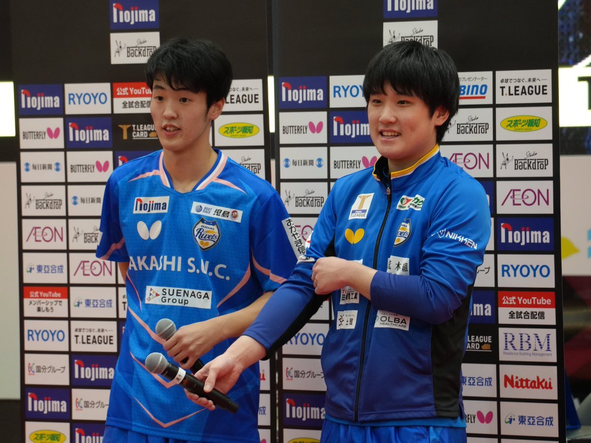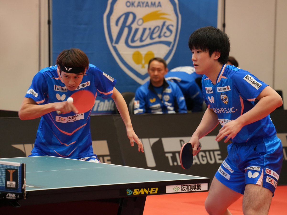 #岡山リベッツ#張本智和 選手は今季初のダブルス出場となった第1試合は落としたものの、第3試合のシングルスは3-0。2点取りと活躍した #谷本拓海 選手については「サーブがすごくうまい。粗削りだが、入った時のボールは伸びがあり、スケールの大きい選手になれるのでは」と期待していました。 pic.x.com/GS6H6WvaAY